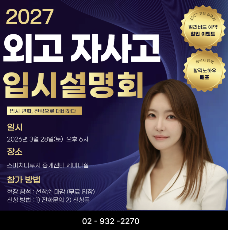 안녕하세요 :-) 스피치마루지 김영숙컨설팅입니다! 2026년 외고 자사고 10명중 8명 꼴로 합격한 신화!! 2027년도의 주인공은 당신입니다! ▽ 2027 외고/자사고 입시설명회 신청 ▽ https://forms.gle/6m2rv2Bgwg1TFnY17 ▽ 카톡 채널 ▽ https://pf.kakao.com/_IJNPn 01. 2027 외고·자사고 입시, 왜 지금부터 준비해야 할까? 외고·자사고 입시는 단기간 성적 향상만으로 대비하기 어려운 입시인거 다들 아시죠? 내신 관리, 비교과 활동, 자기소개서 방향.... 면접 대비까지 단계적으로 준비해야 하기 때문에 준비 시기가 늦어질수록 불리해지는 케이스들을 많이 봤습니다. 많은 학부모님들이 중2~중3 시점에서 준비를 시작하지만, 실제 입시 결과....... <img src="https://blogthumb.pstatic.net/MjAyNjAzMTFfMTMy/MDAxNzczMjA0MjQ2Mjg2.9AvwUp9im0cNIH3MZyT-jFKxJPo-yzk7zr7PLWALFsog.zBhYl2hx1amyVww6a9ec6lirVqeIYXQetCuQqTkdNJQg.PNG/%BF%DC%B0%ED%C0%DA%BB%E7%B0%ED_%C0%D4%BD%C3.png?type=s3" />