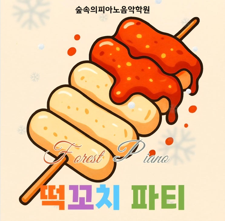 안녕하세요! 전주 혁신도시 숲속의 피아노 음악학원장입니다. 우리 아이들과 함께 떡꼬치 간식 파티를 진행했습니다. 서로 음악 안에서 행복을 나누며 즐겁고 밝은 모습인 아이들의 에너지를 다시 한번 느낄 수 있었어요. 떡꼬치 품절!! 숲둥이들 모두 좋아해 줘서 선생님도 기분 업!! 아이들의 건강을 생각하여 맛있는 쌀을 직접 준비하여 방앗간에 맡겨 진행했습니다! 웃음소리 가득했던 우리 학원 이런 추억이 아이들 마음속에 오래 남길 바라요 저희 본원은 전주혁신 호반 5차 후문 바로 앞 현대빌딩 2층에 있습니다!! (전북 완주군 이서면 출판로 38 / 2층) 위치 꼭 확인해 주세요 ♥ ☺︎ ︎교육상담 예약 ☺︎ (수강생분들의....... <img src="https://blogthumb.pstatic.net/MjAyNjAyMjhfMjY1/MDAxNzcyMjQ1OTkyNTY1.y6HXD_j8CivlpMjua6cBOjPqc0d61udhaJAUHAz1Jakg.JNZl3J_FdWMGmJpK7szfmMW5nlo3gGRrEt-dKBI8G-0g.JPEG/IMG%A3%DF1520.JPG?type=s3" />