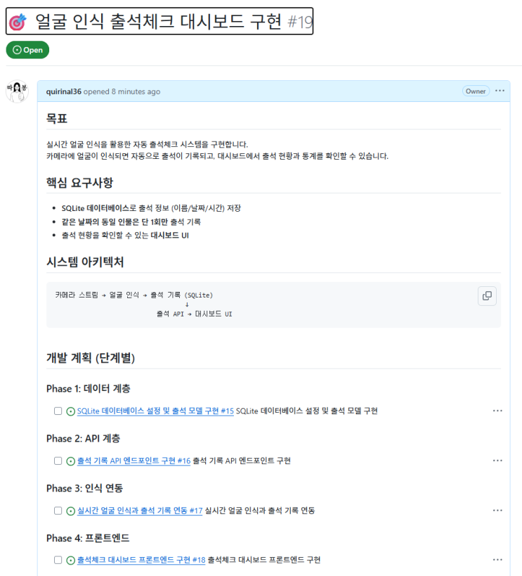 [vive 코딩 6단계] : 출석체크 대시보드 만들기 얼굴인식이 자연스럽게 잘 되고 있다. 이제 출석 대시보드를 만들기 위해 기능을 추가 해보자. 생성된 계획 문서 확인 인공지능이 기능을 추가 하고있는 모습 메뉴가 새로 추가된 모습 나 혼자 사용하기에 손색이 없을 정도 디자인도 매우 깔끔하게 나왔다. 얼굴인식을 통해 출석이 확인되면 보호자 또는 담당자 에게 알림을 전송하는 기능이 추가되면 좋겠다. <img src="https://blogthumb.pstatic.net/MjAyNjAyMjhfMzYg/MDAxNzcyMjM2MzUyMjg2.uYx1NyXW8zUZaZQvlmyPI8CWsgWPIO9vwVI-lR-NwpEg.PFojE95nN-xQd4YE8lBAiKKTrWsbpIfRER8RyDVWbcAg.PNG/image.png?type=s3" />