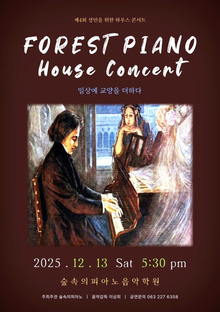 제4회 성인을 위한 하우스 콘서트 ♥️ - 숲속의 피아노 성인을 우한 콘서트 연주회가 벌써 4회를 맞이했습니다. 한 분 한 분 열정으로 공부하며 뜻깊은 연말 무대를 준비했습니다. - 어른이 되어 한 가지를 꾸준히 한다는 건.. 더 어려운 것 같아요. 세상을 더 알고 여러 가지를 할 수 있는 능력이 많음에도 불구하고요.. 하지만 바쁜 일상에도 공부하고 노력한다는 건 그만큼 더 진실되고 진정성으로 임하는 것 같아요. - 우리 선생님들 모두 축하하고 응원하고 격려합니다. 모두 멋진 피아니스트♥️♥️ 일상에 교양을 더하다. 스페셜 게스트로 피아니스트 이예닮 선생님도 출연하셔서 이번 공연 기대가 더 가득했었습니다. ....... <img src="https://blogthumb.pstatic.net/MjAyNjAzMDFfMTQx/MDAxNzcyMzQ0ODI3OTMx.SIVOecFoXVIj3LLstr5caT97uHEiLOXBIlanseB8c_wg.xhS6bBCknmBgqy_BiRdYh7ersX3rykDSkWhctGG3JOYg.JPEG/output%A3%DF1220210323.jpg?type=s3" />