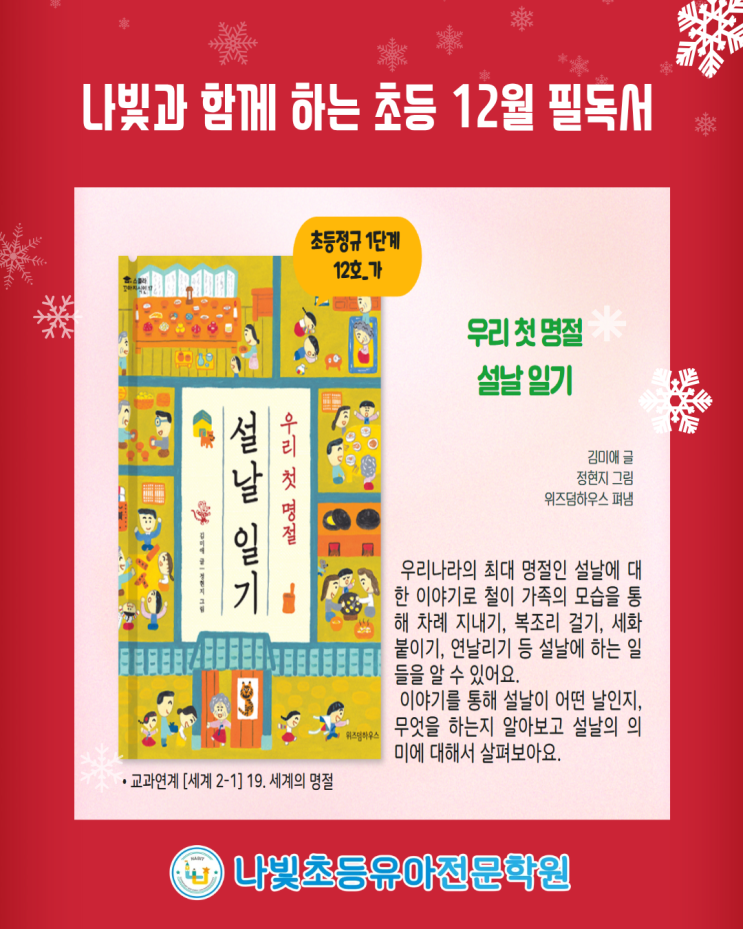 안녕하세요, 나빛초등유아전문학원입니다. 찬 바람이 불어오는 12월입니다. 곧 아이들이 기다리는 겨울방학이 시작되는데요. 학년이 올라가기 전인 지금이 바로 아이들의 '독서 그릇'을 넓혀줄 가장 중요한 시기입니다. 왜 지금 독서가 중요할까요? 1️⃣ 모든 학습의 도구, '문해력'의 기초 학년이 올라갈수록 교과서의 지문은 길어지고 어휘는 어려워집니다. 글을 읽고 핵심을 파악하는 능력은 국어뿐만 아니라 수학, 사회, 과학 등 모든 과목 성적의 밑거름이 됩니다. 2️⃣ 생각하는 힘, '비판적 사고력' 단순히 줄거리를 아는 것을 넘어, "왜 주인공은 그랬을까?", "나라면 어떻게 했을까?&qu....... <img src="https://blogthumb.pstatic.net/MjAyNTEyMDFfMjIw/MDAxNzY0NTcyMzczMjc4.gTO5BLl3-Lyy1R3PE5YH1jP84GXivECLwkPiHmi9DI4g.s-Dktlj95L1t_lt0hEoj1A9yetifgrPe_dlNRDXj4qIg.PNG/2.png?type=s3" />