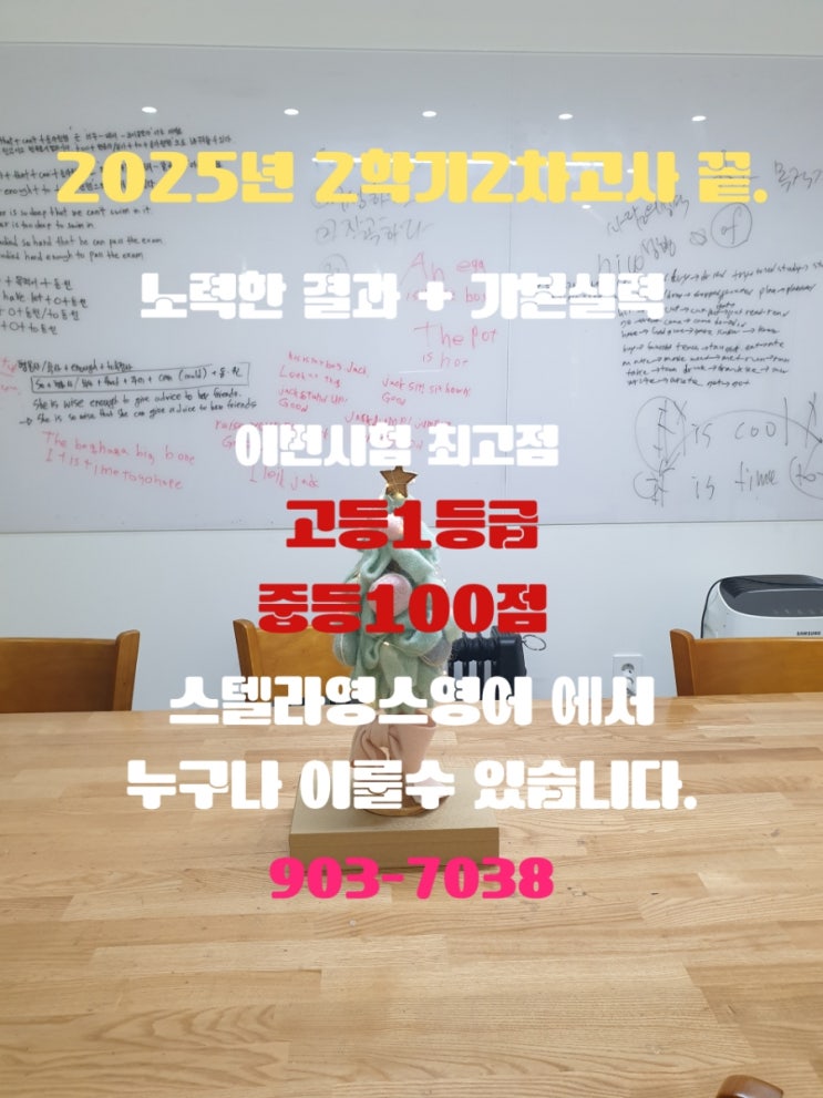 2025년 2학기2차고사가 끝났습니다. 열심히 했지만 성적은 최고 100점부터 최저80점 까지 다양하게 나왔습니다. 물론 100점은 맞은 학생은 만족하지만 아쉽게 한두개 틀린 학생들에게는 아쉬움이 남을수 밖에 없습니다. 그러나 중요한것은 본질적으로 발전 했다는 점 입니다. 일년을 잘 마무리 하고 새로운 학년을 위해 준비해야할 시점 입니다. #스텔라영스영어학원, #스텔라영스영어, #전주혁신영어학원, #온빛중영어학원, #양현고영어학원, #양현중영어학원, #만성중영어학원, #우석고영어학원, #완산고영어학원, #전일고영어학원, #기전여고영어학원, #호남제일고영어학원, <img src="https://blogthumb.pstatic.net/MjAyNTEyMDhfMTk2/MDAxNzY1MTc2ODg0NzMz.faXtt-TQ9v3x6kuV3_HDcNEqhYBaue-gfDWe9KDgtfgg.-ykmuxpCEl0TOsSSgmvg_KD0aL5bu6Gt6BpNV5ZPqecg.JPEG/900%A3%DFB612%A3%DF20251208%A3%DF153812%A3%DF867.jpg?type=s3" />