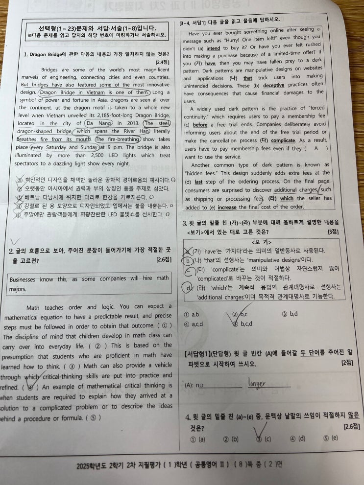 안녕하세요, 에이콘 중고등관입니다. 지난 목요일에 치러진 양현고 1학년 기말고사 분석을 하려고 합니다. 전체 난이도 평가 ① 전반적 체감 난이도: 약간 어렵다 전체 문항을 살펴본 결과, 시험 범위는 본문 2과 부교재 6개 독해, 25년 10월 모의고사 18~45번까지 문법 문항은 기본문법 + 문맥 기반 고급 선택형 혼합 서술형(특히 영작)은 학생 수준에서 부담되는 난이도 ② 변별력 요소 문장 삽입·순서·내용 일치 등 고난도 독해 문제 다수 문장 구조 판단(분사구문, 관계대명사, 동명사 등) 영작 서술형에서 표현 능력 요구 선택지가 유사해 정교한 독해 필요 따라서 전체적으로 시험범위 내용을 충분히 숙지 한 친구들에게 내용 접근은 어렵....... <img src="https://blogthumb.pstatic.net/MjAyNTEyMDhfMjgg/MDAxNzY1MTU4NjExMDA1.b6Gqbf-2wsf3pBByK8-c93gaUGsIRXkEFAuKWNe-op0g.Bd8L6Pz-Qs97Ye77f4ljCjg3vR_0ttBtrnXqCs2njmQg.JPEG/KakaoTalk_20251205_122557468.jpg?type=s3" />