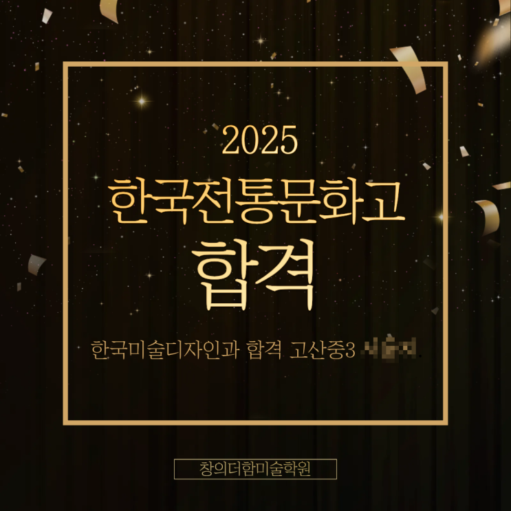 안녕하세요~ 아이들이 행복한 상상을 마음껏 펼칠 수 있는 곳 완주 봉동 창의더함 미술학원 입니다 오늘은 2026 한국전통문화고 신입생이 된 창의더함미술학원 학생의 합격 소식입니다! 우리 중3 친구가 준비해온 길을 결국 해냈습니다 놀고 싶어하는 시간에도 참고, 스스로 선택한 길에 책임지고 달려온 만큼 값진 합격이랍니다. 다가오는 2026년, 너의 새로운 시작을 진심으로 축하해! 아이들이 행복한 상상을 마음껏 펼칠 수 있는 곳 창의더함 미술학원 입니다! ▲ 이미지를 클릭하시면 전화 연결로 이어집니다. <img src="https://blogthumb.pstatic.net/MjAyNTEyMDhfNjAg/MDAxNzY1MTg2MDMzMzkx.IjdDIXxP7wTnAYXYPXG9-XEDzaD4gber-U5vAtuSsHIg.zCT6cjvW7lRE9ffW5P7Lsl2T38yISJZpaJp1MfnrXHUg.PNG/KakaoTalk_20251201_195254003.png?type=s3" />