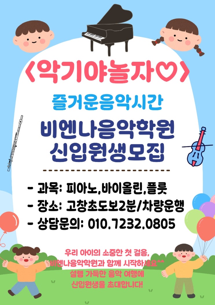고창비엔나음악학원 신입원생모집 ❤️ 악기야 놀자 ❤️ - 대상 : 악기를 즐겁게 배우고 싶은 모든 친구들 - 과목 : 피아노, 바이올린, 플릇 - 장소 : 고창초도보2분, 차량운행 - 상담문의 : 010.7232.0805 비엔나 신입원생 친구들~~ 모두모두 환영해요 바른 음악 교육! 탄탄한 기본기! 아이가 좋아하는 친절한 눈높이 음악교육! 고창비엔나음악학원 우리아이 첫음악 교육! 매일 성장하는 비엔나 친구들... ☎️ 010 7232 0805 #고창피아노학원#고창바이올린#고창플릇#고창음악학원#고창군학원연합회 <img src="https://blogthumb.pstatic.net/MjAyNjAyMjNfMTYz/MDAxNzcxODUzOTczMDEz.WMK1xb0oAG95Sp5bpeZFsuf39M8rc07CnE3hmfcWOP4g.KPXanfdCvUvJoHmvr5fYU108G5zx7Q0mekR7XZPIIOog.JPEG/%C1%A6%B8%F1%C0%BB%A3%AD%C0%D4%B7%C2%C7%D8%C1%D6%BC%BC%BF%E4%A3%DF%A3%AD001_%A3%A818%A3%A9.jpg?type=s3" />