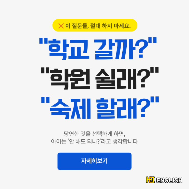 "엄마, 오늘 학교 가기 싫은데..." "그래? 그럼 오늘 쉴까?" "학원 가야 하는데 배 아파..." "그럼 오늘은 안 갈까?" "숙제하기 싫어..." "그럼 내일 할까?" 혹시 이런 대화, 익숙하신가요? 18년간 아이들을 가르치며 가장 안타까운 순간이 있습니다. 바로 "당연히 해야 할 일"을 선택의 문제로 만들어버린 아이들을 만날 때입니다. 학교는 가야 합니다. 아프면 병원은 가야 합니다. 약속한 수업은 들어야 합니다. 숙제는 해야 합니다. 이건 선택의 문제가 아니라 당연한 일입니다. 하지만 요즘 많은 부모님들이 무심코 아이에게 "당연한 것"에 대한 선택권을....... <img src="https://blogthumb.pstatic.net/MjAyNjAyMDhfMTQw/MDAxNzcwNTYxNzAwMjM2.lkKTYyBd1Rw7zUYyGmqrqIQS_7Yd1kUm-mWWBEnoQPgg.CqQo4o93R_8Xc_uKfJDyhnldCZTjVIBZYXMB1LuHSV8g.PNG/1.png?type=s3" />