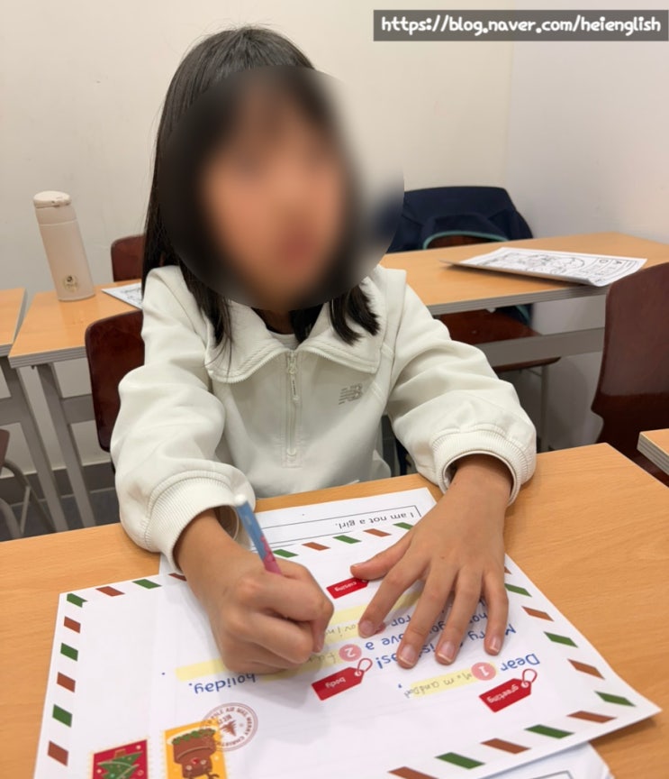안녕하세요, HEI English입니다! 2025년 12월 23일(월)과 24일(화), 이틀에 걸쳐 아이들과 함께 특별한 크리스마스를 보냈어요. 영어로 감사의 마음을 전하고, 하얀 눈처럼 설탕이 묻은 핫도그를 나눠 먹으며, 크리스마스의 진짜 의미를 배우는 시간이었답니다. Dear mom and dad, Thank you for... 크리스마스는 선물을 받는 날이기도 하지만, 더 중요한 건 감사의 마음을 나누는 날이에요. 이번 수업에서는 영어 편지글의 형태를 자연스럽게 익히면서, 감사 표현들을 배워보았어요. "Dear mom and dad," "Thank you for..." "Love," 같은 편지의 기본 구조를 배우면서, 아이들은 각자의 방식으로 고마운 마음을....... <img src="https://blogthumb.pstatic.net/MjAyNjAxMDRfMjY3/MDAxNzY3NTM2MDA0NjQ0.AZY-UP9frEEe_OcjJlhR5lWvogfJe_wtqPLJ3the7XEg.nL6xCc8LGnWiwb6L_hjm-asGIoLVRcpdFxJbB0qi15og.JPEG/IMG%A3%DF4382.jpg?type=s3" />