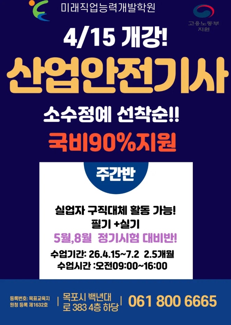 국비지원 90% ♂️2026년 취업 자격증! 산업안전(산업)기사 국비 지원 수강생을 모집합니다 취업 지원은 물론, 실업급여 구직활동까지 인정받을 수 있는 기회! 놓치지 마세요. 5월 8월 기사시험 대비반입니다!! 필기와 실기 모두 강의 ,교재 무료!!! ️ 일정 안내개강: 4월 15일 (주간반) 시간: 오전 9시 ~ 오후 4시 정원: 20(선착순 마감 예정) 수강 혜택국민취업지원제도 1유형: 0원 (전액 무료) 학원등록번호 목포교육지원청 등록 제 1632호 학원의 종류: 평생직업교육학원 수강료 고용24 게시참고 <img src="https://blogthumb.pstatic.net/MjAyNjAzMTlfMjc4/MDAxNzczODk3NzcyMzk2.YdAOL7rQyOoD1wr61Qn2bziZsMAhSy-NL5iT5oenjgIg.QIk28BAb1AhTvHXahgG4SghzfnXAmTtatsTW_K54uXwg.JPEG/900%A3%DF%C1%A6%B8%F1%C0%BB%A3%AD%C0%D4%B7%C2%C7%D8%C1%D6%BC%BC%BF%E4%A3%DF%A3%AD003_%A3%A82%A3%A9_%A3%A81%A3%A9.jpg?type=s3" />