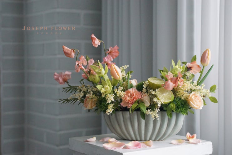 <센터피스 집중반> 조셉플라워스쿨 센터피스 집중반 수업 중 이번 시간에는 오벌 화기를 활용한 센터피스 디자인을 중심으로 수업을 진행했습니다. 오벌 화기는 부드러운 흐름과 안정적인 비례를 동시에 요구하는 화형으로, 기본 구조에 대한 이해가 무엇보다 중요한 디자인입니다. 그래서 이번 수업 역시 형태를 빠르게 완성하기보다 이론과 기본 원리를 차분하게 짚어가며 습작 위주로 진행했습니다. 유럽 · 영국 플라워 디자인의 기본을 바탕으로 조셉플라워스쿨은 유러피언, 특히 영국 플라워 디자인의 클래식한 구조와 원칙을 기반으로 커리큘럼을 구성하고 있습니다. 화기의 형태를 이해하고 중심과 흐름, 앞뒤의 깊이와 좌우 밸런스....... <img src="https://blogthumb.pstatic.net/MjAyNjAyMjZfMjIz/MDAxNzcyMDkwOTU5NjU1.IZIbtUnceTVZ_Jwhaw7D59HWiXLzLGd6zzwRnLQdzyEg.fAd1GJlTYS5Xji_zdzta01wX-06r5GQvNdi5tSrr3aMg.JPEG/DSC00014.jpg?type=s3" />