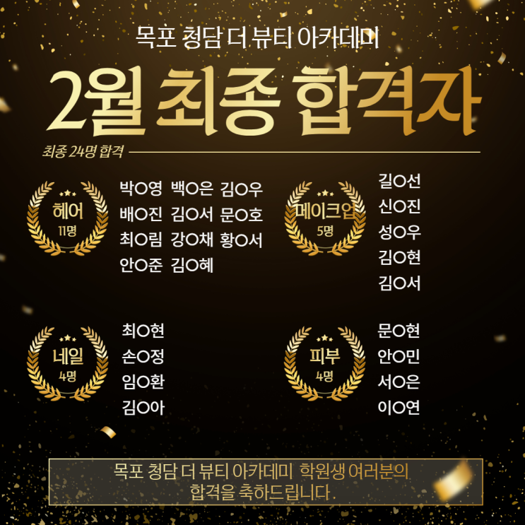 . . . 안녕하세요 목포 미용학원 청담 더 뷰티 미용학원입니다 : ) 이번 포스팅에서는 저희 학원의 자랑스러운 소식을 전해드리고자해요!! 목포 청담 더 뷰티 미용학원 2월 총 24명 최다 합격자 배출! 헤어 · 메이크업 · 네일 · 피부 각 파트에서 높은 합격률을 기록했는데요~~!! 광주 미용학원에서 배우다 목포까지 찾아오는 이유는~~~?? 청담 더 뷰티만의 체계적이고 꼼꼼한 교육 시스템 때문이겠죠. 국가자격증을 위해 열심히 달려온 우리 수강생 여러분 정말 고생 많았습니다. 그럼 2월 합격자 함께 보러 가실까요? Let's go~~~~~!!! 많은 합격생 뒤에는 선생님들과 수강생들의 노력이 있겠죠? 목포 청담 더 뷰티 미용학원은....... <img src="https://blogthumb.pstatic.net/MjAyNjAzMDVfMjA0/MDAxNzcyNjkzODM2NDI4.Fg-46r8x93ZW17E_KtnPEFNCf00vwGnxtT-0LWqarTYg.rpC0QQ4FEOZTZnrACyRu2J-lByNdX6exKqZYikdZFzkg.PNG/image.png?type=s3" />
