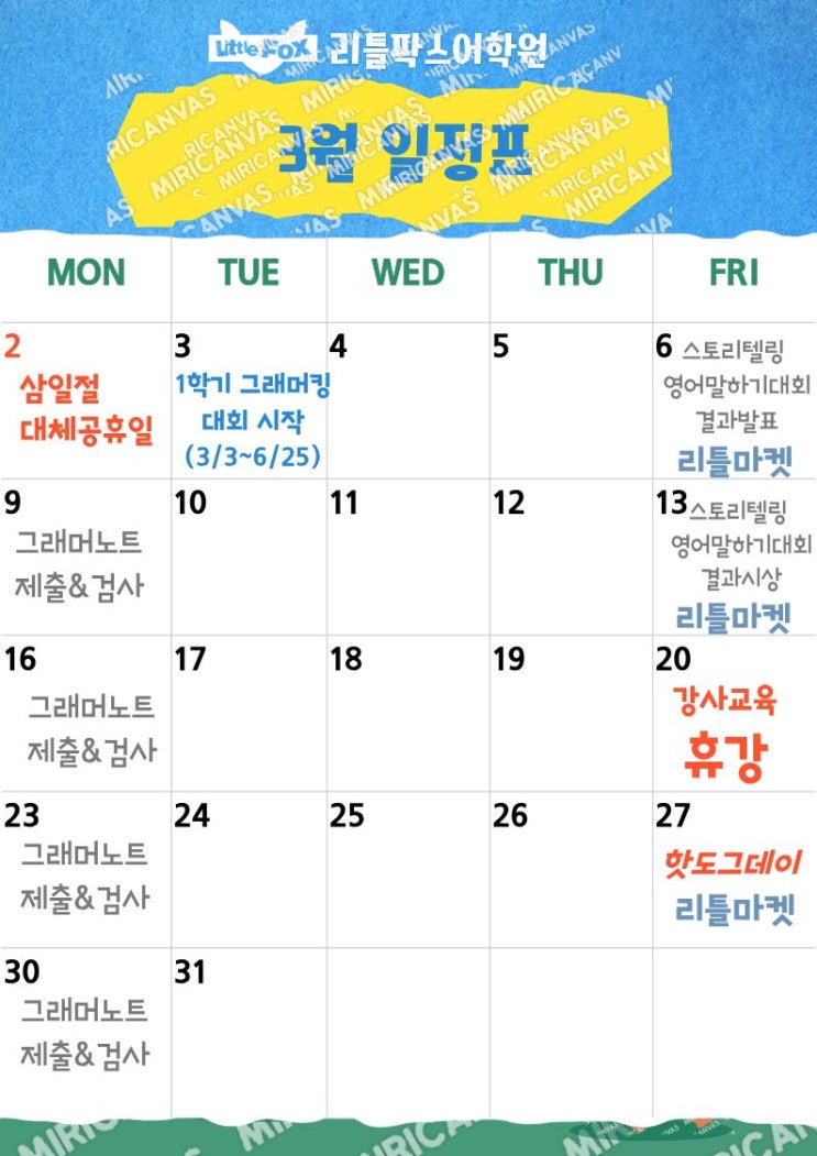 리틀팍스 어학원 3월 일정 안내 안녕하세요. [목포 영어 수학 학원] 리틀팍스 어학원 & 비원 학원입니다 새 학기가 시작되는 3월, 아이들에게는 새로운 출발의 달이기도 합니다. 리틀팍스에서도 아이들이 즐겁게 배우고 자신감을 키워갈 수 있도록 알찬 프로그램들을 준비했습니다. 3월 주요 일정을 안내드리겠습니다. 3월 2일 (월) 삼일절 대체공휴일 이날은 학원 수업이 없습니다. 가정에서 편안한 휴일 보내시기 바랍니다. ✏️ 3월 3일 (화) 1학기 그래머킹대회 시작 3월 3일부터 1학기 그래머킹 대회가 시작됩니다. 기간은 6월 25일까지 진행됩니다. 그래머킹 대회는 아이들이 문법을 단순히 외우는 것이 아니라 꾸....... <img src="https://blogthumb.pstatic.net/MjAyNjAzMDZfOTgg/MDAxNzcyNzIzNzI4NzE0.ai6bYaLo3r4-waB_ZHpkEQaY9OLwLN4ocHjxFK3Im0Ug.3HyuGovqVJ1cuDA6mcj1QD2XeV4-lSHkBaVj4U8ZjAYg.JPEG/1772723403247.jpg?type=s3" />