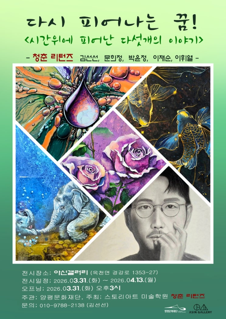 “꿈에는 유효기간이 없다” 시니어 예술가 5인의 이야기, 《청춘리턴즈 – 다시 피어나는 꿈》 아신갤러리에서 개최 아신역 내 아신갤러리에서 시니어 예술가 5인의 그룹전 **《청춘리턴즈 – 다시 피어나는 꿈》**이 오는 3월 31일부터 2주간 개최된다. 이번 전시는 스토리아트 미술학원 시니어 작가들이 참여하여, 나이를 넘어 다시 피어나는 창작의 열정과 삶의 이야기를 담아낸다. ■ “끝이 아닌, 또 다른 시작” 시니어 예술가의 창작을 조명하다 이번 전시는 ‘나이 듦’을 끝이 아닌 새로운 시작으로 바라본다. 참여 작가들은 각자의 삶 속에서 축적된 경험과 감정을 바탕으로, 오랜 시간 품어온 꿈을 예술로 다시 피워낸다. 전시는 시....... <img src="https://blogthumb.pstatic.net/MjAyNjAzMjBfMjY4/MDAxNzczOTc0MzE1NzY5.6qUACd7uh7QdcMxCirnZao1xJrm3wOQku7wH02ybDBsg.8d5QahClfkYpC7jJcJgQYjuNgQfRSEGgLRzzHZ6gH-Qg.JPEG/900%A3%DF1773973895490.jpg?type=s3" />