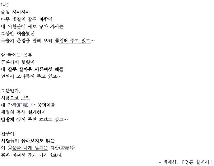 2027 수능특강_박재삼, <정릉 살면서> ■ 박재삼, <정릉 살면서> 해제 이 작품은 고혈압으로 쓰러졌던 시인이 건강을 회복한 후 정릉에 살면서 쓴 시이다. 화자는 바람, 햇빛, 실개천과 같은 자연을 통해 자신의 지나온 삶에 대한 위안을 얻는다. 그리고 삶에 대해 감사하는 마음과, 자연과 함꼐 살아가고자 하는 소망을 노래하고 있다. ■ 박재삼, <정릉 살면서> 핵심 정리 ★날다국어 2관★ 중/고등 내신국어/수능국어 학교별/교과서별 대비 국어 문법/ 영문법 핵심개념/심화/실전 내신국어/수능국어/내신영어/수능영어 동시 대비 수능국어/수능영어 영역별 맞춤 클리닉수업 #박재삼, #정릉 살면서, #수능특강, #고등국어, #....... <img src="https://blogthumb.pstatic.net/MjAyNjAzMTdfMTEg/MDAxNzczNzI4NjYzNDQ2.zQBiZCgVR-uPkz_sCIEunZIm5-OePS1vThq9PUqd3T8g.Ds6OMG85D5zbtY6anQBg_CCB93QBziHl79uzxVl8970g.PNG/image.png?type=s3" />