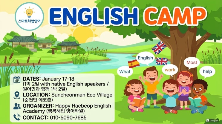 안녕 하세요~ 대주3차 상가2층에 행복해법영어학원 앤젤라 입니다.^^ 1월 17일 ~ 18일 까지 영어 캠프 다녀온 이야기를 들려드립니다. 2달 전부터 준비한 이번 영어 캠프는 많은 선생님들의 노고와 열정으로 가득한 프로그램들을 짜고 준비하며, 우리 아이들이 행복해 할 모습만 떠올리며, 힘듬을 즐기며 준비하는 시간이었습니다. --목 차-- 1. 영어 골든벨 2. Drawing 3. 저녁식사 4. Guess the Number 5. Simon Says 순천만 에코촌에서 하룻밤 자고 먹으며 새로운 친구들, 언니 누가 형 동생들을 사귀며 영어로 말해보고 게임도 하고 영어 골든벨도 하였습니다. 1. 영어 골든벨 골든벨 하는 중~~ 대부분의 아이들이 탈락하고 남아있는 단....... <img src="https://blogthumb.pstatic.net/MjAyNjAxMjBfODQg/MDAxNzY4OTA0MDk3MjQw.mbXGWfPetzu1eErU9Y1OxhhNbr31SdvB117-A2KptMwg.GG5W0cQeMMB2_YHW-Zhq0fekKz5bovPjXCHC_us7RKQg.JPEG/%BF%B5%BE%EE%C4%B7%C7%C1.jpg?type=s3" />
