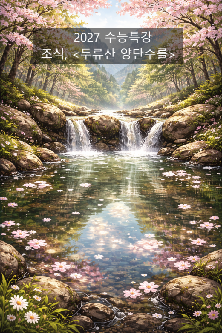 2027 수능특강_조식, <두류산 양단수를> ■ 조식, <두류산 양단수를> 해제 이 작품은 조선 시대의 학자 조식이 지리산에서 학문에 전념하던 시기에 쓴 평시조이다. 화자는 두류산 양단수에 대해 말만 듣다가 직접 그곳을 본 뒤 '무릉도원'과 같다고 말하며 예찬적 태도를 드러내고 있다. ■ 조식, <두류산 양단수를> 핵심정리 ■ 조식, <두류산 양단수를> 표현 ★ 언어비상 날다스카이 ★ 중/고등 내신국어/수능국어 학교별/교과서별 대비 국어 문법/ 영문법 핵심개념/심화/실전 내신국어/수능국어/내신영어/수능영어 동시 대비 수능국어/수능영어 영역별 맞춤 클리닉수업 <img src="https://blogthumb.pstatic.net/MjAyNjAxMjdfMjEw/MDAxNzY5NDg1MjA0OTk2.bH1-Na6O6Xgmw9_Skd-Ew__pM5iwefvA9l2oqTQIqOIg.iiHbvfMDNNS3BSdCSuA_S3Sgsm2rkrl3pXWOWVZwKIMg.PNG/900%A3%DF1769484100120.png?type=s3" />