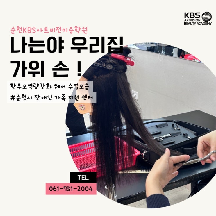 안녕하세요 :) 순천KBS아트비전미용학원입니다! 오늘은 순천시 장애인가족지원센터와 함께한 학부모 역량강화 헤어 수업 현장을 소개해 드리려고 합니다. 이번 수업에서는 가발을 활용한 커트 교육이 진행되었습니다. 처음 커트를 접하시는 분들도 쉽게 이해할 수 있도록 ✔️ 긴 머리 상태에서 ✔️ 섹션을 나누는 방법 ✔️ 커트 빗 사용법 ✔️ 가위 잡는 방법과 기본 커트 까지 차근차근 설명하며 실습을 진행했습니다! 처음에는 가위를 잡는 것부터 어색할 수 있지만 직접 가발을 이용해 연습하면서 점점 손에 익어가는 모습을 볼 수 있었는데요 강사님의 설명을 들으며 한 단계씩 따라 하다 보니 점점 커트의 기본 원리와 방법을 이해....... <img src="https://blogthumb.pstatic.net/MjAyNjAzMTJfMjA4/MDAxNzczMjgzNTQzNjUw.ejXSo_EIPep6j1xqjqFtDVapxVvxv56ai5MlPDhAUngg.Uz9ghU5S_TuDF_vPrfmOaWw1644X52HNzChssARnjG0g.JPEG/IMG%A3%DF6924.jpg?type=s3" />