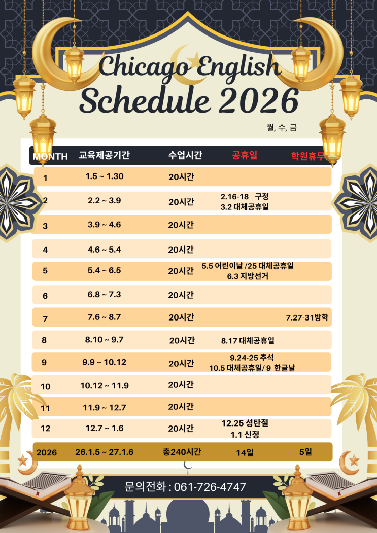 안녕하세요. 시카고잉글리쉬입니다. 우리 아이들 영어실력이 한 뼘 더 자라날 2026년이 시작되었어요. 학부모님과 학생들이 미리 계획을 짤 수 있도록 2026년 시카고잉글리쉬의 학사일정을 미리 올립니다!!! 주5일 등원 일정표 월수금 등원 일정표 화목금 등원 일정표 1. 저희 학원은 겨울방학이 1일로 짧은 대신, 여름방학을 5일간 시행합니다. 2. 수업시간은 한달 20시간에 맞춰져 있습니다. 2026년에도 변함없이 최선을 다하겠습니다. 감사합니다. <img src="https://blogthumb.pstatic.net/MjAyNjAxMDdfMzcg/MDAxNzY3NzYyOTg0MTM2.uAnDHV2WscMG8ZbmlKIUY3JUXxgB-U9fondo12OkbR8g.AdeYvVAfeOTHXdMaC123q6BZbxWKFS4at_W5IqiaVe0g.PNG/%BF%F9%BC%F6%B1%DD.png?type=s3" />
