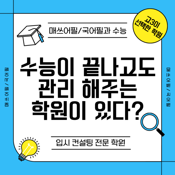 안녕하세요 매쓰어필 국어필 입니다 !!! 요즘 아침저녁으로 공기가 선선해지면서 진짜 가을이 성큼 다가온 게 느껴지죠. 이런 날엔 공부하기도 한결 수월해지는 것 같아요. 오늘은 많은 학부모님들과 학생들이 궁금해하시는 입시 전략 이야기를 해보려고 해요. 저희 학원은 단순히 수업만 진행하는 곳이 아니라, 학생 한 명 한 명의 성향과 목표에 맞춘 입시 컨설팅을 체계적으로 제공하고 있어요. 특히 지원 전형 분석부터 일정 관리, 합격 가능성 진단까지 꼼꼼히 챙겨드리기 때문에 매년 높은 만족도를 얻고 있답니다. 입시는 수능 당일로 끝나지 않아요 . 많은 학생들이 “수능 끝났으니 이제 학원도 끝”이라고 생각하지만, 진짜 중요....... <img src="https://blogthumb.pstatic.net/MjAyNTExMTRfMTc4/MDAxNzYzMTEzMDkwMjk0.9MwTNlQEbbmGmWYsQFl48NmpoYpR5Z2-C054_S6ePngg._7QcwAQCPvPIA4LzPPweeHv7zkqb_x4fQmnmmCC3JoUg.PNG/%EB%B8%94%EB%A1%9C%EA%B7%B8%EC%A0%9C%EB%AA%3F.png?type=s3" />