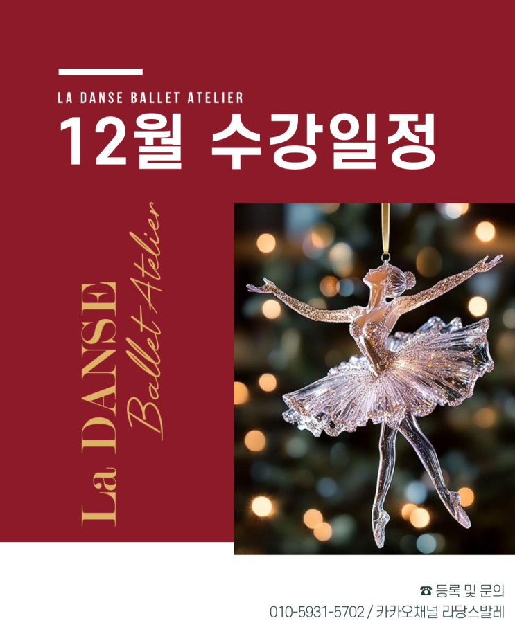 La Danse Ballet Atelier 라당스 무용학원 목동원 12월 수강안내 12월 수강등록 11월 20일 (목) ~ 30일(일) ※ 한 수업에 3명 미만 등록시 개강이 불가할수도 있습니다. 개강불가시 등록가능한 시간으로 안내해 드립니다. 12월 수강기간 12월 1일 (월) ~ 28일(일), 4주 수업 12월 25일(목) 크리스마스 휴원 12월 목요일은 3주 수업으로 진행됩니다. (해당요일 수강생은 횟수 차감해 수강료 안내) ❄️1월 재등록 12월 20일(토) ~ 28일(일) ️ 1월 개강 12월 29일(월) 예정 발표회 준비관계로 5주차 휴원없이 바로 개강 예정이오니 참고부탁드립니다. <img src="https://blogthumb.pstatic.net/MjAyNTExMjNfMTgg/MDAxNzYzODgzMjQ3NzMw.j5NkW3hTRthIkGtPlBAyCByBlGUb6lpGovKWXA2U1J0g.vReb2v8s15vGDYrCc_s7RbTAjQMFi0zNcVTZlzgvjtUg.PNG/KakaoTalk_20251123_163127946.png?type=s3" />