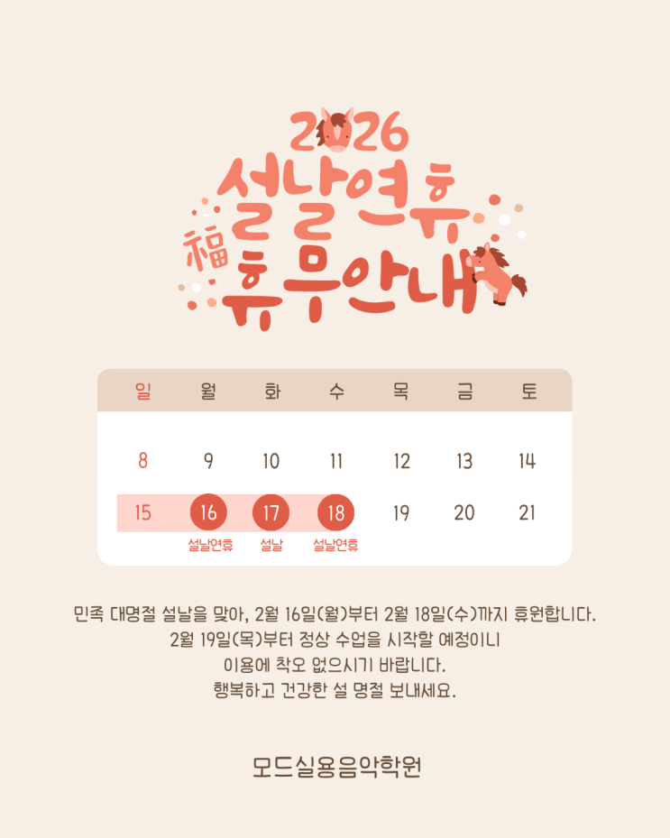 순천모드실용음악학원 설연휴 휴원 안내|순천보컬학원 순천작곡학원 순천미디학원 순천베이스학원 순천드럼학원