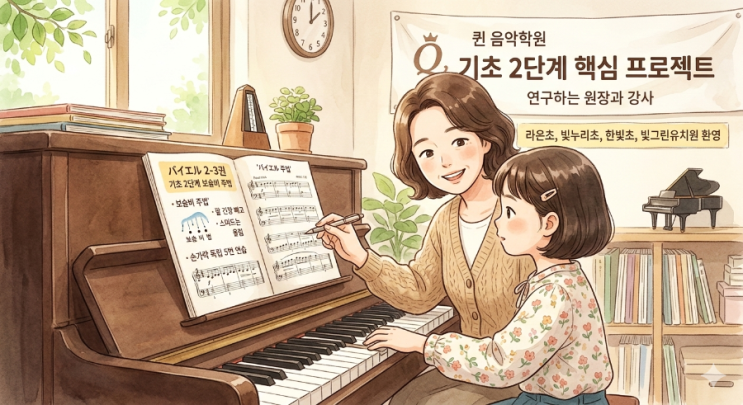 안녕하세요! 나주 빛가람동 퀸음악학원입니다. 우리 빛그린 한빛 빛누리 다야유치원 친구들부터 라온초, 빛누리초등학교 학생들까지, 기초 1단계에서 단단한 '손등의 집'을 잘 지었다면 이제 그 집을 아름다운 울림으로 채울 **[기초 2단계]**를 시작할 때입니다. 교재 : 바이엘 2권 ,병행교재 단순히 진도만 나가는 수업이 아닌, 음악적 근육과 귀를 만드는 퀸만의 핵심 비결 4가지를 소개합니다. ✨ 퀸음악학원: 기초 2단계 핵심 프로젝트 1️⃣ [타건] 때리는 소리가 아닌 '스며드는 울림' * 보슬비 주법: 손가락 힘으로만 힘있게 때리는 소리가 아닙니다. * 팔의 긴장을 빼고 무게를 싣는 타건을 통해, 층간소음 걱....... <img src="https://blogthumb.pstatic.net/MjAyNjAzMThfMTE3/MDAxNzczNzg3ODI2MjI2.H92zeF6M2N17UmvMEX0bUxAFORzAt-gOz2F-fxy2aYog.ElozdiQhqeZcfG4zhlV_gAlE5GMicb8K26RsqcYkWP4g.PNG/900%A3%DF1773773012840.png?type=s3" />