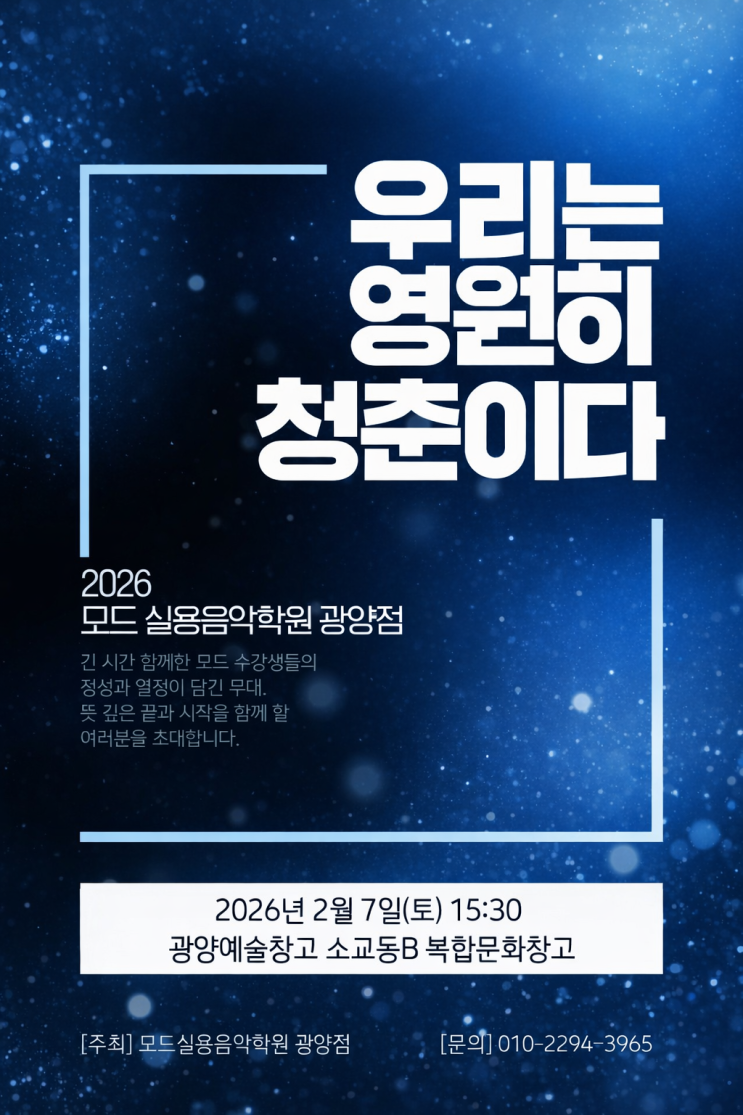 안뇽하세요 모드지기입니다~~~~ 이번에는 따뜻하고 매우 퀄리티 높은 공연을 소개하고자 합니다! 바로바로 저희 모드실용음악학원 정기공연 꺄~~~~~~~~~ 포스터를 이번에는 저희 모드의 여신 김주은선생님께서 만들어 주셨는데요,,, 뭔가 깔끔한것도 같고 살짝 올드한것 같기도하고.. 그래도 성인 분들 도 참여도 많이하시고,, 말그대로 우리는 진심 늘 청춘이니까요 ㅎㅎㅎㅎ 저희 모드실용음악학원 친구들이 열심히 준비하는 이번 공연 모두모두 기대해주시구요... 오실때는 박수 칠 손과 뜨거운 환호성 지를 목 !! 꼭 준비해서 오시구요 그럼 저는 공연준비하러 가보겠습니다~~~~~~~ 가기전에 잠깐 !!! 작년 저희 공연 하이라이트 한번 공유하....... <img src="https://blogthumb.pstatic.net/MjAyNjAxMjhfMTMw/MDAxNzY5NTk1MzkyNjI0.ynu7In1k2JiLjsOqZFCOThhkpJnwxhSDMoG1ur5jCDMg.7q3pKZ46xgiHOjxCz3S4vnkL45qvoHGttix4O3M3weEg.PNG/%B0%F8%BF%AC%C6%F7%BD%BA%C5%CD_%BA%ED%B7%E7.png?type=s3" />