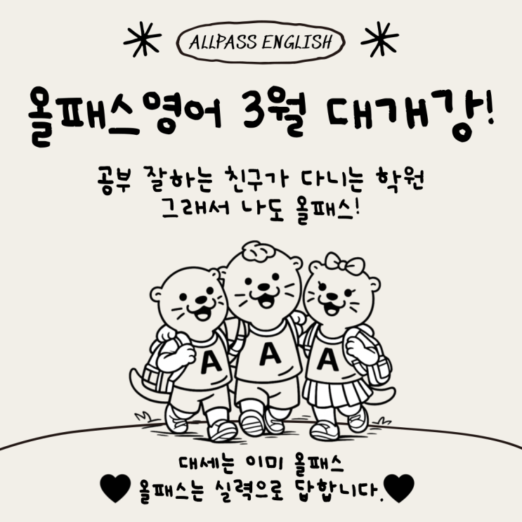 안녕하세요, 올패스영어입니다. 설렘과 기대가 가득한 새학년, 새학기가 시작되었습니다. 한 단계 성장한 모습으로 새로운 출발선에 선 우리 아이들을 진심으로 응원합니다. 학년이 올라간 만큼 학습의 깊이와 책임감도 함께 자라나는 시기입니다. 올패스는 아이들이 변화에 안정적으로 적응하고 한층 더 성장할 수 있도록 곁에서 함께하겠습니다. 3월 신규 단체 레벨 테스트 세부 안내 https://m.blog.naver.com/youyou_tt/224191557706 <img src="https://blogthumb.pstatic.net/MjAyNjAzMDJfOTcg/MDAxNzcyNDU5Mjc4ODM2.4b_RUh0oNapihBFHOcoIrvBZIMRoerThjcu20GKC_VQg.eLgMBtrt6Ytglr2hlFSgl_Y48XYsXVolHNsdlTBv5wIg.PNG/001.png?type=s3" />