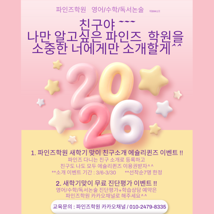 파인즈학원 상담신청서 https://docs.google.com/forms/d/e/1FAIpQLSd-M5IR-2pGVYakQ48jABxJOifyfYn4_pWQ_M2E3C6ZSwvgBw/viewform 교육문의 : 파인즈학원 카카오채널 http://pf.kakao.com/_ePVxeb/chat 친구야~~~~ 나만 알고싶은 파인즈학원을 소중한 너에게만 소개할게^^ 1️⃣ 파인즈학원 새학기맞이 친구소개 에슐리퀸즈 이벤트!! 파인즈학원 다니는 친구 소개로 영어/수학/독서논술 등록하고 친구도 나도 모두 에슐리퀸즈 이용권 선물받자^^ *소개 이벤트 기간 3/6~3/30 *선착순 7명 한정 2️⃣ 새학기맞이 무료 진단평가 이벤트!! 영어/수학/독서논술 진단평가+학습상담 예약은 파인....... <img src="https://blogthumb.pstatic.net/MjAyNjAzMDVfMTMz/MDAxNzcyNzA5OTgyMzUy.BOiQp_K0znGn-3eUE1EUwQCYChO1mPnOUl_5IAYGu80g.XMzADxzGNAyIdrc0r34RFon12acOzUaWXQL6K2JmLuEg.PNG/IMG%A3%DF4426.PNG?type=s3" />