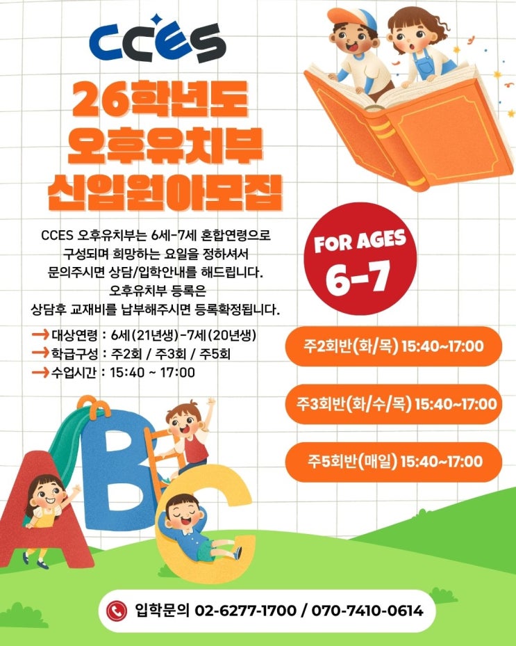 안녕하세요~ 2026학년도 cces 오후 유치부 친구들을 모집합니다. CCES 오후 유치부는 6세, 7세 혼합연령으로 반구성이 된답니다. 시간 : 15 : 40분 ~ 17 : 00 반 구성 : 주 2회(화 목반) , 주 3회(화수목반) , 주 5회(월~금반) 오후 유치부에 관심이 있으실 경우 전화문의하시면 개별상담 및 전화상담 일정 안내해 드리겠습니다. Yeouido CCES 어학원 02-6277-1700 가장 영어적인 환경에서 행복한 Learning 하는 아이들 <img src="https://blogthumb.pstatic.net/MjAyNTExMTlfMTgg/MDAxNzYzNTM0NjM3ODcy.ar4WmbOZYkUSI_Y783gzP-bC0ueEPvT0tvpOdhC4vR0g.0zXPvra0y18_Fxie2Q12J2tZB9KhDwPGrFTjT3rrUnUg.JPEG/26%B3%E2_%BD%C5%C0%D4%B8%F0%C1%FD%BE%C8%B3%BB.jpg?type=s3" />