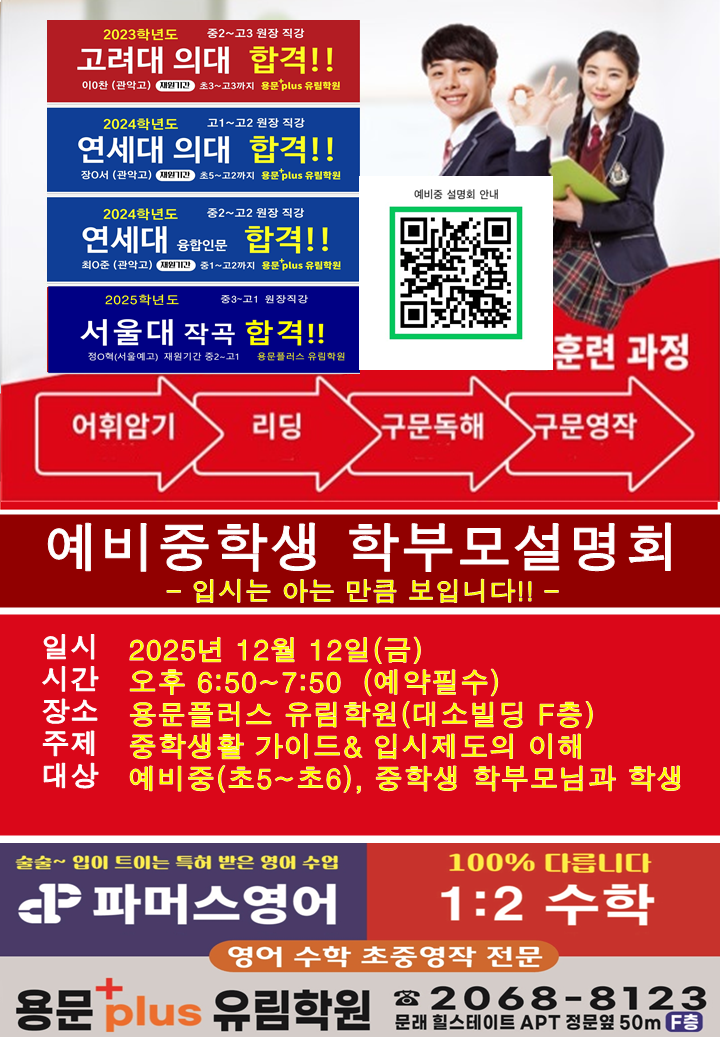 [예비중학생 학부모 설명회] 중학생활 가이드 & 현행 입시제도의 이해[문래동 용문플러스 유림학원][문래동 영어 수학 전문학원]
