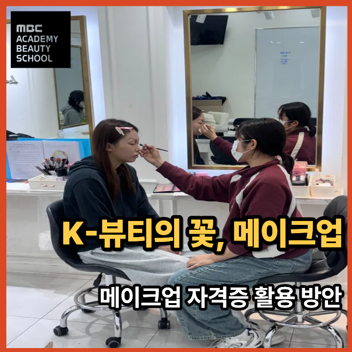 안녕하세요! ✨ MBC아카데미 뷰티스쿨 블로그 지기입니다! ✨ 전 세계를 휩쓰는 K-뷰티 열풍! 그 중심에서 가장 화려하게 빛나고 있는 것이 바로 메이크업입니다. K-POP 스타들의 트렌디한 메이크업부터 자연스러우면서도 빛나는 피부 표현까지, 메이크업은 K-뷰티의 가장 아름다운 꽃이라고 할 수 있죠! 이처럼 뜨거운 뷰티 분야에 대한 열정을 가지고 메이크업 자격증 취득을 목표로 열심히 달려온 여러분! 정말 고생 많으셨습니다! 하지만 막상 자격증을 손에 쥐고 나면 '이걸로 뭘 할 수 있을까?' 하고 고민에 빠지는 분들이 많으시죠? 국가자격증인 미용사(메이크업) 자격증은 단순한 종이 한 장이 아니랍니다! 여러분의....... <img src="https://blogthumb.pstatic.net/MjAyNTEyMDhfMjkz/MDAxNzY1MTU4NzM4MTUx.MbsejHvFofO1e-NSZYSo1le5VTT0ysH5JH6o-EebG-kg.b2bokH-Z55HDoz5V5NU1k2gh0VzPEsBWjpK5D4Pur28g.PNG/2351208.png?type=s3" />