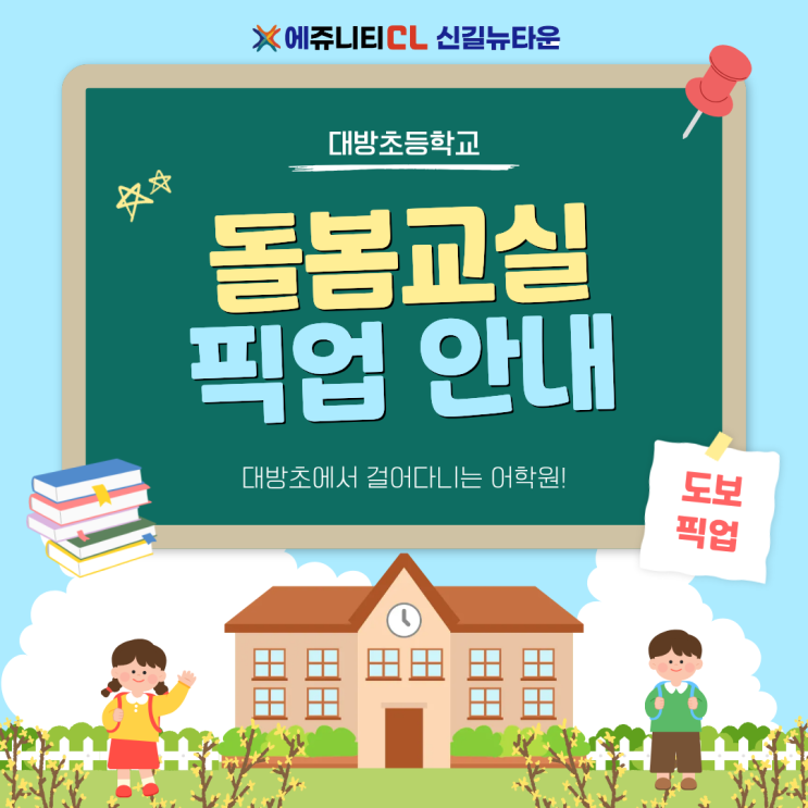 안녕하세요, 대방초등학교에서 걸어서 2분! 에쥬니티CL 신길뉴타운 어학원 입니다. 2026년 03월 03일(화)부터 시작되는 대방초 돌봄교실 무료픽업 안내드립니다. 4교시 후 하교하는 월요일, 화요일은 돌봄교실 이용 후에 1:30에 정문에서 만나 학원으로 함께 이동합니다. 5교시 후 하교하는 수,목,금의 경우 돌봄교실을 이용하지 않고 교실에서 바로 정문으로 이동해주세요. 1:30에 대방초 정문에서 만나 학원으로 함께 이동할께요! 2부 타임은 3시 10분에 정문에서 만나서 학원으로 함께 이동합니다. 학원 팻말을 들고 정문에서 학생들을 기다리고 있겠습니다. 아이들이 안전하게 등·하원 동선을 익힐 수 있도록 차분히 지도하며 돕겠습니다. 항....... <img src="https://blogthumb.pstatic.net/MjAyNjAyMjVfMjAz/MDAxNzcyMDA0MTM2MzY2.-GGVlb2q6IXK4oqY2PXL0ozE1X2X9jBmya3iK-Q_98Ig.396w9WwyqMJYRRuXhDq0xHM0HkTn9fCxfFS2SWOb6V8g.PNG/%B4%EB%B9%E6%C3%CA_%C1%A4%B9%AE_%C7%C8%BE%F7.png?type=s3" />