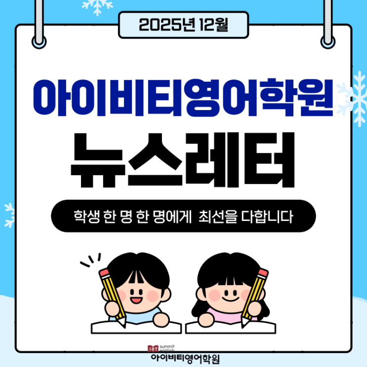 안녕하세요? 어느덧 2025년을 마무리하는 12월을 앞두고 있네요. 우리 아이비티영어학원 학생들의 쑥쑥 커가는 키만큼이나 실력도 키우기 위해 계획을 미리 세우게 되는 시기입니다! 아이비티영어학원 학생들의 각 가정에서도 한해를 잘 마무리하시고 더욱 알찬 새해를 맞이하는 계획을 세우시는 따뜻한 12월이 되시기 바랍니다. 아이비티영어학원의 12월 일정 및 공지사항 안내드립니다~ 아이비티영어학원에서는 현재 재원생을 대상으로 한 레벨테스트가 진행중입니다. 신규생들의 문의도 많아서 올웨이즈원장쌤이 주말에도 상담을 하고 있습니다. (바쁘신 학부모님들께서는 미리 예약주세요!) 2026년 아이비티영어학원의 수업은 소수인원으로 진....... <img src="https://blogthumb.pstatic.net/MjAyNTExMjBfMjY5/MDAxNzYzNjIzNDQ4OTUx.S_39HJwVrYhVRC7aaw8s1LR7zB_B0pa1eSpqF_BpuhYg.ncETF3YF5OTdBu-VrdFqZ9C4sxFFYsWrvJExRuzgcWAg.PNG/image.png?type=s3" />