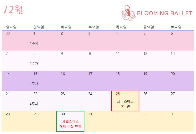 안녕하세요. 블루밍발레아카데미입니다 :) 12월 스케쥴과 수강신청 오픈 안내드립니다. 12월 스케쥴 개강일 12월 1일(월) 종강일 12월 27일(토) 본 원은 4주 기준 수업으로 진행되며 12월 수업 12월 1일(월) 개강합니다. 수강 등록 기간 기존 수강생 및 회원 재등록 기간 11월 20일(목) - 11월 25일(화) 까지 선착순 신청 마감 신규 수강생 및 회원 등록 기간 11월 26일(수) - 11월 29일(토) 까지 선착순 신청 마감 ▶ 2025년 12월 유.초등 신규 모집 월/수 3시, 화/목 3시, 화/목4시 초등수업 학생 모집합니다. 수강 등록 4명 이상일 때 개설 됩니다. ▶ 2025년 12월 오전,오후 성인 기초반 신규 모집 Lv.0 기초반 오후 월 9:30, 수 9:30, 금 7:....... <img src="https://blogthumb.pstatic.net/MjAyNTExMjBfNjcg/MDAxNzYzNTY2NDM5ODI4.czWd0Ggt9QKMMB5aTjq3GkgR54d3PprHR6GU4jXpTGcg.WbCWUix4XYsjTn_Ei4Hx9tDXQDSyC2wnFLI8H9p4K2Qg.PNG/%C1%A6%B8%F1_%BE%F8%C0%BD.png?type=s3" />
