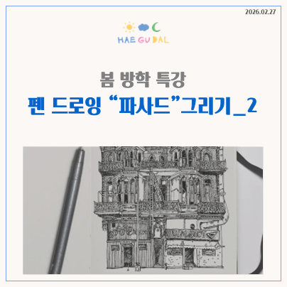 펜드로잉으로 건물을 그려보자! - 파사드의 이해부터 완성까지 안녕하세요, 해구달미술입니다! 지난 포스팅에서 펜드로잉의 기초 - 펜 선택, 펜 잡는 방법, 그리고 다양한 선 그리기 연습에 대해 배웠어요. 이제 이 모든 기초를 활용하여 실제 건물의 파사드를 그리는 방법을 배워볼 차례입니다! 오늘 수업에서 해구달 친구들은 지난 시간에 연습한 기초 선 긋기를 충분히 복습한 후, 제공된 건물 스케치에 펜으로 윤곽선을 그리고, 해칭을 사용하여 건물에 그림자를 표현했습니다. 그 결과는 정말 놀라웠어요. 처음에는 떨리던 손으로 그렸던 선들이, 마지막 단계에서 해칭으로 음영을 입히는 순간 모두 생생하게 살아났거든요. 건....... <img src="https://blogthumb.pstatic.net/MjAyNjAyMjhfMTE4/MDAxNzcyMjY4NjE3ODM4.LrhwU1EK6C6SN9szri3z7PZG3KKtNiR0WoNfItdR8uog.CqqF2X_GgHgdLubwfgDBph6jAgWgWoKggIcpNqYhnagg.PNG/펜드로잉(2).png?type=s3" />
