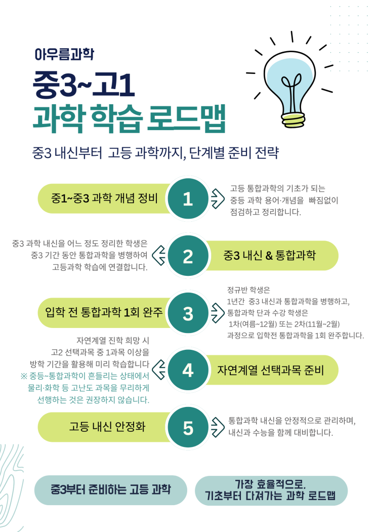 안녕하세요, 아우름과학입니다. 중학교에 들어오면 국영수와 달리 과학은 그동안 꾸준히 학습해온 과목이 아니어서, 체감 학습량과 난도가 높아지는 특징이 있습니다. ‘어디서부터 시작해야 할지’, ‘얼마나 깊게 준비해야 할지’ 막막해하시는 경우가 많습니다. 특히 요즘은 통합과학이 수능 과목이 되면서, “고2·고3 선택과목을 미리 해야 하나요?” “중학교 때 어디까지 준비해두는 게 맞나요?” 라는 질문을 정말 많이 받습니다. 과고·영재고를 준비해온 최상위권 일부를 제외하면, 대부분의 학생들은 학교 수업 위주의 일반적인 학습 경로를 밟아왔습니다. 그렇다면 이런 학생들은 고등과학을 어떤 순서로, 어떻게 준비하는 것이 맞을까....... <img src="https://blogthumb.pstatic.net/MjAyNjAyMTJfMjc5/MDAxNzcwOTAwMzE5MzA5.7bGvhLzgcUHpj2nFcGWZbGdcd7vKIbXLjIrJ_AQjnHYg._SHd3jwJvc39UnjCd5Z2FfF1fAMMB3aOBXTUTBqQad4g.PNG/Project_%281%29.png?type=s3" />