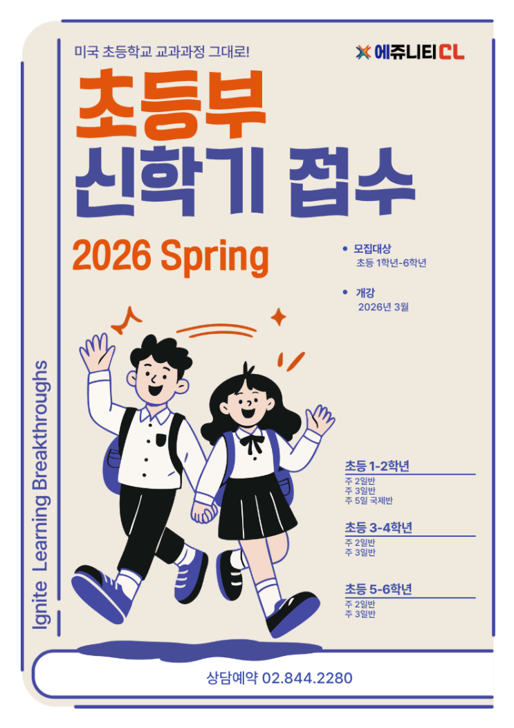 2026학년도 3월 신학기 초등부 입학 안내 안녕하세요! 미국학교 그대로! 에쥬니티CL 신길뉴타운 어학원입니다. 2026학년도 초등부 신학기 입학 안내 드립니다. 에쥬니티CL어학원 신길뉴타운점은 셔틀버스를 운행하며, 학교 정문 픽업 대상 학교는 하단에서 확인 가능합니다. 초등 저학년 영어, 왜 에쥬니티CL 일까요? 초등 1~3학년 시기는 영어를 학습이 아닌 언어로 받아들여야 하는 시기입니다. 정확한 파닉스 정착, 읽기 유창성 확보, 기본 문장 활용, 말하기 자신감 형성 등 미국 학생들이 모국어(영어)를 배우는 방법 그대로! 영어를 즐겁게 자연스럽게 체득합니다 :) *초등 1학년부터 체계적인 영어 습관 잡기 *영어유치부 출신 이후....... <img src="https://blogthumb.pstatic.net/MjAyNjAyMTlfMzYg/MDAxNzcxNDY3MTk1MDYx.2F9ZVaswRL9s8c456dEmmBvT8A_biBXkljt-adYGLCUg.u78ZWEIhNBQxGfdSnppV5ZZlHNRv3ELvDKqOLPuacacg.PNG/%BF%B9%BA%F1%C3%CA1.png?type=s3" />