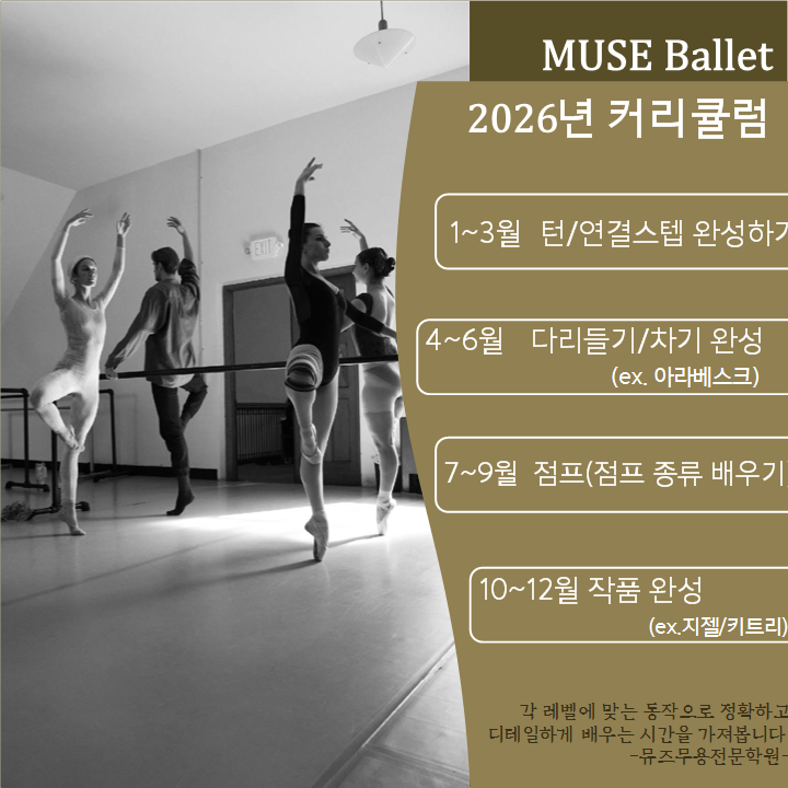 2026년 부터는 더욱 체계적으로 발레를 배울 수 있게 3개월씩 나눠서 수업을 이어갑니다. 발레에는 턴에서도 다양한 턴을 이용한 동작들이 많고, 점프도 다양한 동작들을 연결하면서 배울 수가 있습니다. 이 외에도 너무나 많은 동작들을 배워야 발레 동작들을 연결해 작품을 배울 수 있습니다. 뮤즈를 운영하면서 지켜본 결과 오래 배운 회원 분들 기준, 동작 습득과 몸을 이해하는 능력이 빠르게 성장하였습니다. 좀 더 욕심을 내자면 발레 고유의 디테일과 집요함을 더 가져가셨으면하는 바램으로 2026년부터는 좀 더 체계적인 방식으로 나아가면 좋겠다는 결론을 얻었습니다.^^ 그래서 3개월 씩 큰 틀에서(ex. 점프--> 아쌈블레, 그랑주떼....... <img src="https://blogthumb.pstatic.net/MjAyNjAzMTZfNzgg/MDAxNzczNjUxMzE0NTIy.NYmQ7kSblzaI8Ot87XTX0NgixIt0bx6wnNdQV4Y_hYAg.EDyV_Q3ZbTkd2_i8ntK_jfQ-Vze_CWSe2DJ8XEXdYckg.PNG/2026%B3%E2_%C4%BF%B8%AE%C5%A7%B7%B3.png?type=s3" />