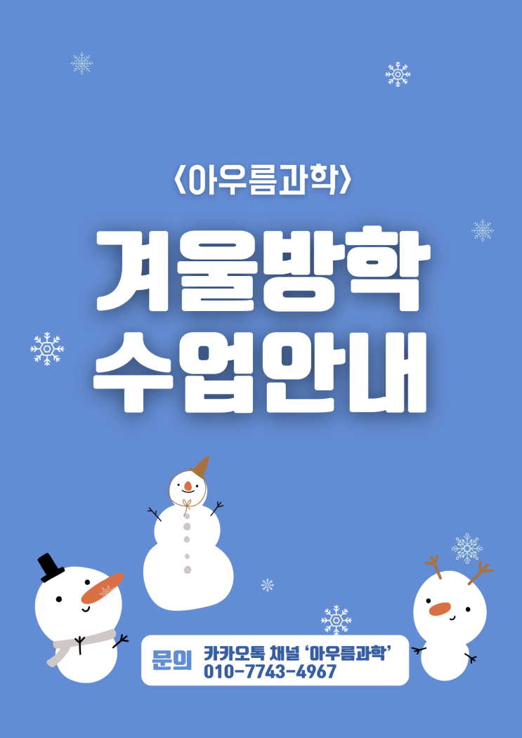 안녕하세요, 아우름과학입니다. 짧은 가을이 지나가고, 기말고사가 어느새 한 달도 채 남지 않았습니다. 기말고사가 끝나면 지금의 학년이 마무리되고, 곧바로 새 학년을 준비해야 하는 시기가 찾아옵니다. 학기말 시험 준비도 중요하지만, 겨울방학을 어떻게 보내느냐가 다음 학년의 성과를 좌우하기에 아우름과학에서는 겨울방학 수업 계획을 미리 안내드리고자 합니다. 1. 예비중학생 2. 중등부(예비 중2, 중3) 3. 고등부(예비고1, 고2) 중학교 과학을 처음 시작하는 예비중학생들을 위한 수업입니다. 1) 초등 대상 중등 과학 정규반 중등 물/화/생/지 파트별로 12주씩 진행되는 수업입니다. 1월부터 목, 토요일에는 중등 지구반이, 금요일에....... <img src="https://blogthumb.pstatic.net/MjAyNTExMjJfMTgg/MDAxNzYzNzc4MTIyNTU5.6M6XPMVrACqDCja1-hPfnWjRv6XQWxBojaXXJ6fY9bEg.YaBoLPcYczV17VxEfzWCubBBPphQc_x5EVp1bEVl2Zsg.PNG/9%C1%D6.png?type=s3" />