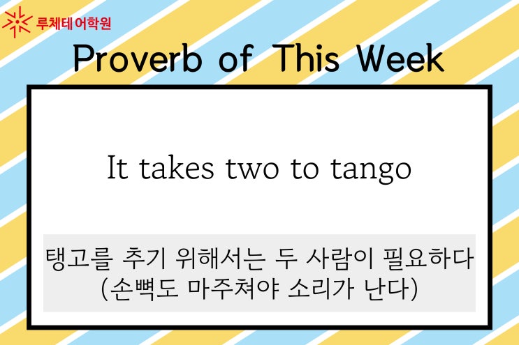안녕하세요, 루체테어학원 영등포캠퍼스입니다. ^_^ 이번 주도 지난주에 이어 시험에 나오는 영어 속담 1개를 배워보고자 합니다. 새 속담을 배우기 전에 복습을 해볼까요? The squeaky wheel gets the grease. '삐걱거리는 바퀴가 기름을 얻는다(우는 아이 젖 준다)' 한 번 더 소리 내어 말해보면서 위의 속담을 기억해 보길 바라요! 자, 그럼 이번 주 속담은 무엇일까요? 바로~~~!!! It takes two to tango. '탱고를 추기 위해서는 두 사람이 필요하다 (손뼉도 마주쳐야 소리가 난다)' 위의 속담은 직역하면 “탱고를 추려면 두 사람이 필요하다"라는 뜻이에요. 하지만 실제로는 “어떤 일이 잘되거나 잘못되기 위해....... <img src="https://blogthumb.pstatic.net/MjAyNTEyMDRfMjQ2/MDAxNzY0ODMxNTIxMzk2.IvRSJ76GCMLTpY4jdWtPrbvYjUncitCSjhLASwUzF2Yg.HGxhyL-U75dx5RdzaSYOFpaghyBZcf6lZHV2yzoHlusg.JPEG/%BC%D3%B4%E3_91.jpg?type=s3" />