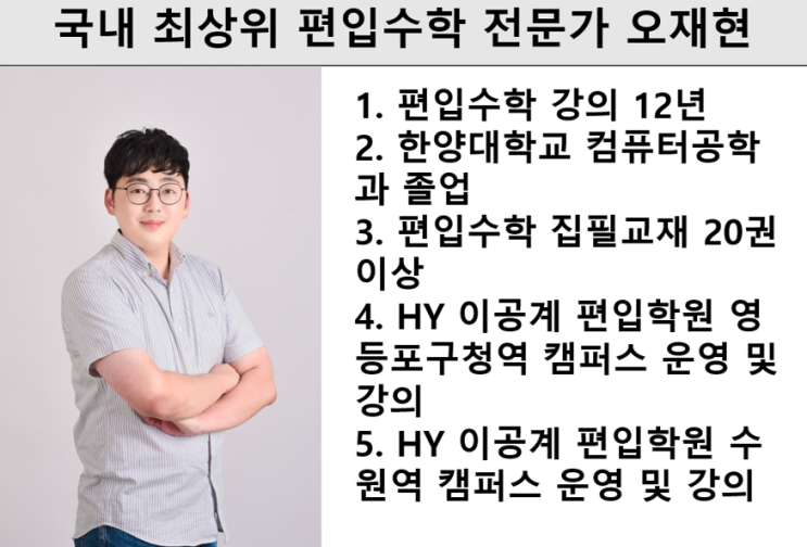 www.hymath.co.kr 공대편입은 편입수학 비중이 매우 높습니다. 편입수학 100% 전형 편입수학,토익전형 편입수학 편입영어 전형이 있습니다. 편입수학 위주의 공대편입 전문학원에 대해 소개하고자 합니다. HY 이공계 편입학원 추천 이유 편입수학 확실한 강사진. 편입수학을 가르치는 강사는 많지만 학력,경력,집필교재 등 공개하고 가르치는 강사는 극소수입니다. HY 이공계 편입학원 오재현 원장은 편입수학 강의 12년 이상. 한양공대 편입합격경험. 편입수학 베테랑 강사 입니다. 2. 철저한 소수정예 맞춤형수업 한 클래스 10~15명 이하 소수정예 칠판 판서수업 정규수업이 끝난 이후 1대1 질의응답 클리닉 수업 참여가 가능합니다. 1대1 질의....... <img src="https://blogthumb.pstatic.net/MjAyNTEyMDZfMjk3/MDAxNzY0OTk1MzIwNDMz.k1VjQsDwFKCD9H96PG8mQwrOXRsvKaVTdUgKEk41y5og.TLagXzzexMc8efSqofNcCCGM5mhaFWc-_ww_mgbYSXwg.PNG/image.png?type=s3" />