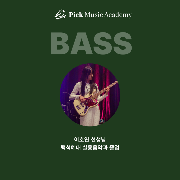 베이스 / 콘트라베이스 강사 이호연 선생님 안녕하세요! 픽 실용음악학원입니다 오늘은 다양한 무대 경험과 탄탄한 연주력을 바탕으로 공연·녹음·앙상블까지 폭넓게 활동 중인 베이스 & 콘트라베이스 강사 이호연 선생님을 소개합니다. 라이브 공연부터 웨딩 연주, 음원 녹음까지 현장에서 요구되는 연주 감각을 고루 갖춘 연주자로, 곡과 상황에 맞는 베이스 라인과 앙상블 안에서의 역할을 중시하는 실전 중심 레슨을 진행합니다. 주요 경력 | JOB EXPERIENCE KT&G 상상마당, 무신사 개러지, 라디오 가가 등 다수 공연 진행 (2023.03 ~) 前 조이 실용음악학원 출강 前 신도림 웨스턴 베니비스 웨딩팀 – 콘트라베이스 연....... <img src="https://blogthumb.pstatic.net/MjAyNjAyMDdfMjIx/MDAxNzcwNDQ4MjEwMDk1.LQL9SS5eHAoJJ4QbQP_5r6DV2MIg5D5XlnvijDcW9ocg.0sIz_CBcEnFKQpXLkGlB_mpvViHhLDT7g8yORZFof9Qg.PNG/%C0%CC%C8%A3%BF%ACT%C8%AB%BA%B8%BB%E7%C1%F8.png?type=s3" />