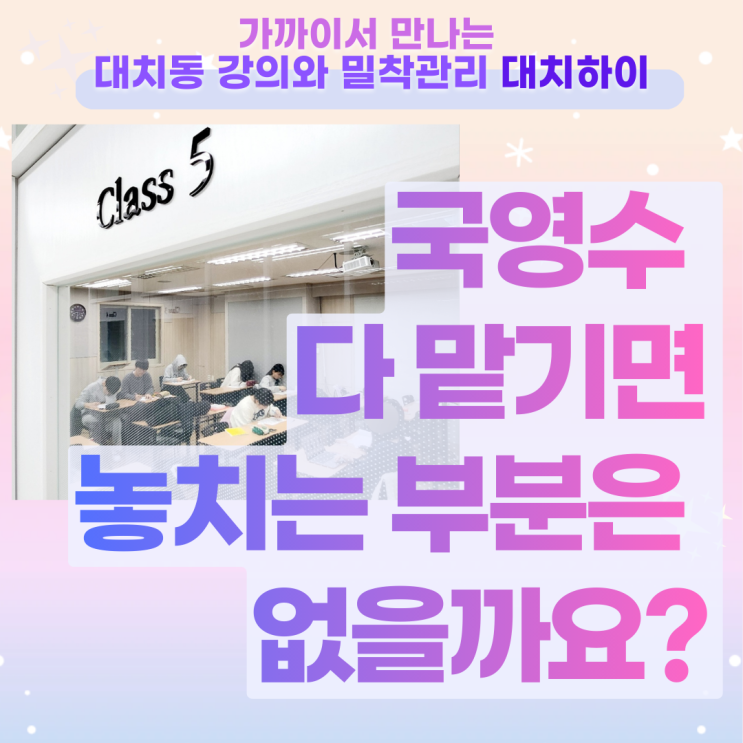 대치하이학원 서울 영등포구 당산로 159 휘선 빌딩 6층 본관 7층 프리미엄관 "국영수를 한 학원에 다 맡기면 놓치는 과목이 있지 않을까요?" 원생이 200명이 넘으면 우리 아이 이름도 모르는 것 아닐까요? 상담할 때 가장 많이 듣는 질문입니다. 이 질문에 대한 대치하이의 답은 무엇일까요? 함께 풀어가 보시죠! ^^ 서울시 영등포구 당산동 대치하이학원은 처음부터 국영수 종합학원은 아니었습니다. 원장이자 영어 강사 한 명, 학생 0명에서 시작했죠. 영어 수업만 듣던 학부모님들이 국어도 같이 보내고 싶다며 개설 요청을 해주셨고, 다음 해에는 “수학까지 한 번에 관리해 주세요”라는 요청이 이어졌습니다. 과목을 늘린 것이 아....... <img src="https://blogthumb.pstatic.net/MjAyNjAyMTlfNTIg/MDAxNzcxNDk0Mjk4MDA4.YP2iKGrn6HxiMms2HwF3NmQfERYIHiM_QBIHdOjLncMg.WSr07N4wd9e8TKzEwZyg1Pygr4UxCzwNBmwfXt7pOyMg.PNG/%B1%B9%BF%B5%BC%F6.png?type=s3" />