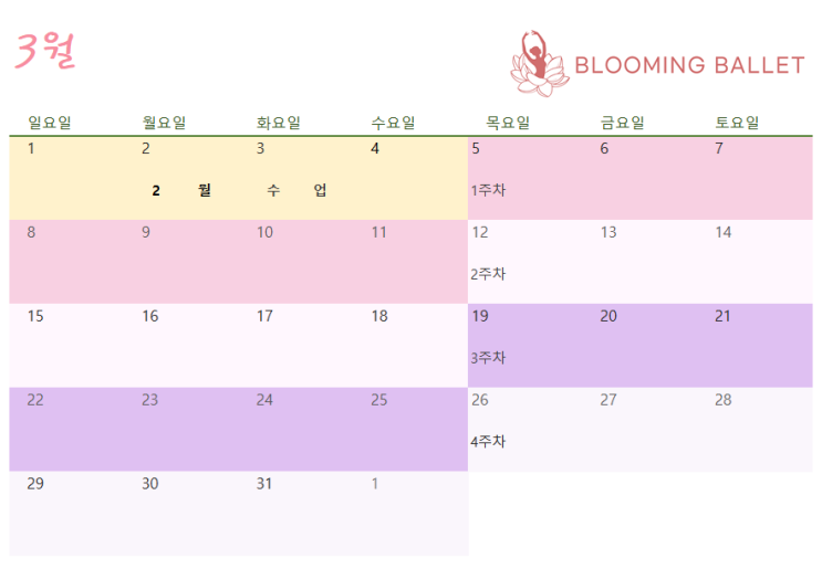 안녕하세요. 블루밍발레아카데미입니다 :) 3월 스케쥴과 수강신청 오픈 안내드립니다. 3월 스케쥴 개강일 3월 5일(목) 종강일 4월 1일(수) 본 원은 4주 기준 수업으로 진행되며 3월 수업은 3월 5일(목) 개강합니다. ★ 2월 수업이 설 연휴로 인하여 3월 4일까지 진행되어 3월 수업은 4월 1일 종강입니다. 꼭 확인 부탁드립니다 ^^ 수강 등록 기간 기존 수강생 및 회원 재등록 기간 2월 20일(금) - 2월 25일(수) 까지 선착순 신청 마감 신규 수강생 및 회원 등록 기간 2월 26일(목) - 2월 28일(토) 까지 선착순 신청 마감 ▶ 2026년 3월 유.초등 신규 모집 ▶ 2026년 3월 오전,오후 성인 기초반 신규 모집 2026년 함께 발레 할 새로운 수강생 모집....... <img src="https://blogthumb.pstatic.net/MjAyNjAyMjBfNDEg/MDAxNzcxNTE0MDA5ODI4.rFPWNHr1inEgNf5h9-BCCaRcNYPsURL253d69gDIa6Ig.zpfziQGvgwrypvoh56jnEKRDMejUdw-k36lN34N6OB8g.PNG/%C1%A6%B8%F1_%BE%F8%C0%BD.png?type=s3" />