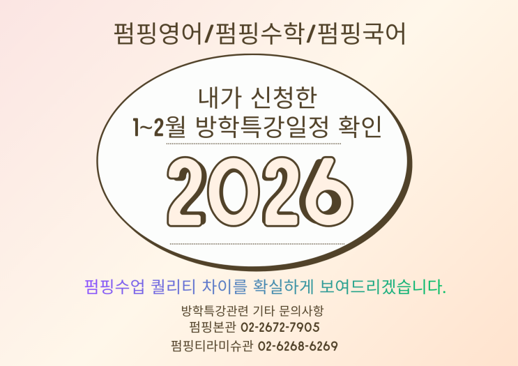 안녕하세요 펌핑 영어·수학학원입니다. 이번 겨울방학 동안 본 학원은 방학 없이 정상 운영되며, 방학특강 수업을 통해 학생들이 부족한 학습 부분을 보완하고 새로운 학습 영역을 익힐 수 있도록 지도하고자 합니다. 해당 특강 요일을 확인하시어 자녀의 학습 일정에 참고해 주시기 바랍니다. 본 학원은 정원을 초과하지 않는 소수 정원 맞춤형 수업으로 운영되며, 학생 개개인의 학습 수준과 특성을 고려한 밀착 지도를 통해 책임감 있게 수업을 진행하고있습니다. 아울러 방학특강의 경우 결석 시 별도의 보강 수업이 제공되지 않으므로, 원활한 수업 진행을 위해 가급적 결석하지 않도록 학부모님의 협조를 부탁드립니다. 앞으로도 학생 한 명....... <img src="https://blogthumb.pstatic.net/MjAyNTEyMjhfMjMz/MDAxNzY2ODgxMjQ2ODQ3.MK0MPdAGH6a5m8wH8D68GScxVohVTdzuGYVfX2e2-PYg.gZmX2QE7Uj4SPWAirHFDO5ZOJzBFB5jQIbJoW3i63OYg.PNG/%B9%E6%C7%D0%C6%AF%B0%AD_%C0%CF%C1%A4%C8%AE%C0%CE1.png?type=s3" />