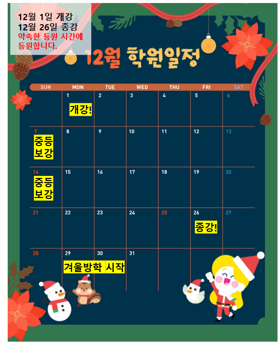 12월에는 참 이벤트가 많네요!! 12월 15일 영원중 대영중 영어 기말고사가 있습니다. 12월 7일/14일 중등 보강 2-5시 있습니다. 12월 24일 중3들과 마지막 졸업 파티 12월 29일- 2026년 1월 2일 겨울방학이 있습니다. <img src="https://blogthumb.pstatic.net/MjAyNTExMzBfMjkw/MDAxNzY0NTE0MDI5MTk0.lwKIkQ19o-dJCP6FH_H5OmJEPwWQ2d3wHilZgrzgGuEg.d8aj76tj39uHgizu9SlYpyQ9VFel0fqm7ymwLukbsGYg.PNG/IMG%A3%DF1617.PNG?type=s3" />