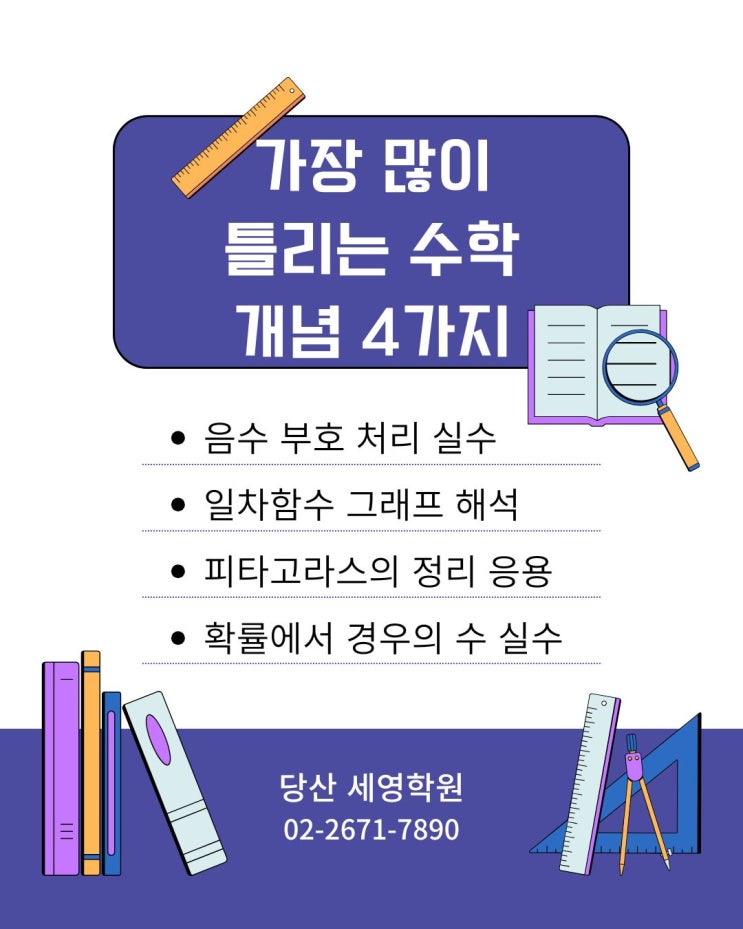 안녕하세요. 세영학원입니다. 기말고사 대비가 본격적으로 시작되면서, 수업 시간마다 공통적으로 보이는 '헷갈림 포인트'들이 있어요. 오늘은 최근 시험 대비에서 가장 많이 실수하는 개념 4가지를 학년별로 깔끔하게 정리해볼게요. 혹시 우리 아이도 여기에 해당한다면, 지금부터라도 충분히 잡을 수 있으니 걱정은 금물입니다! 음수 부호 처리 실수 (중1 필수 개념) 중1 친구들이 가장 많이 틀리는 부분이 바로 '부호'입니다. 특히 다음 상황에서 실수가 반복됩니다. * 괄호 앞에 '-'가 붙었을 때 * 음수 x 음수 구조 * 식을 정리하다가 '+, -'가 헷갈리는 경우 계산 자체는 할 줄 아는데, 부호에서....... <img src="https://blogthumb.pstatic.net/MjAyNTEyMDJfMTE5/MDAxNzY0NjU5MTAwMDY5.SjT2KTXCQeIzI3nbObOAAGvhFy9S8TDRwsyD9uc2-3Yg.0Awj5qHGPUUHtMuy05BowiPyv8-KWDn8Vao7Sv966YIg.JPEG/%BA%B8%B6%F3%BB%F6_%B1%F2%B2%FB%C7%D1_%B0%F8%BA%CE_%C0%CF%B7%AF%BD%BA%C6%AE_%BC%F6%C7%D0%C7%D0%BF%F8_%BE%C8%B3%BB%BB%E7%C7%D7_%C0%CE%BD%BA%C5%B8%B1%D7%B7%A5_%B0%D4%BD%C3%B9%B0.jpg?type=s3" />