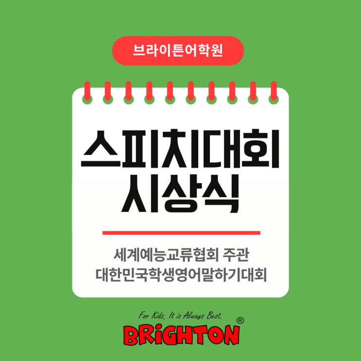 안녕하세요, 브라이튼어학원 입니다! 지난번 블로그에서 보셨죠~? 브라이튼어학원에서 2025학년도 대한민국학생영어말하기 대회에서 우수한 성적을 거두었답니다! 그래서 우리 자랑스러운 원생들의 시상식 시간을 가졌습니다! 유치부 전체 1등을 포함해 대상 3명 최고상 2명 그 외 최우수상과 우수상까지! 모두 휩쓴 멋진 친구들이랍니다! 모두 정말 고생했고 축하합니다! 브라이튼어학원의 비결이 궁금하신 학부모님들께서는 브라이튼의 문을 주저말고 두드려주세요! 함께 보면 좋은 글 <img src="https://blogthumb.pstatic.net/MjAyNTEyMDVfMjYy/MDAxNzY0OTA3OTI0NjM1.2VUGDPnGBk69Rr6DCGpX-1IOR2V5-23C8oXCP62uAXEg.U_TUt_0z2hpfTO-Lot_NVpMKdzpn2HyW7Lb0I_no5Pkg.PNG/%C6%C4%B6%F5%BB%F6%B0%FA_%BF%AC%B5%CE%BB%F6_%BD%C9%C7%C3%C7%D1_SNS_%BA%ED%B7%CE%B1%D7_%C4%AB%B5%E5%B4%BA%BD%BA_%C5%B8%C0%CC%C6%B2_%BD%E6%B3%D7%C0%CF_%C0%CE%BD%BA%C5%B8%B1%D7%B7%A5_%B0%D4%BD%C3%B9%B0_%285%29.png?type=s3" />