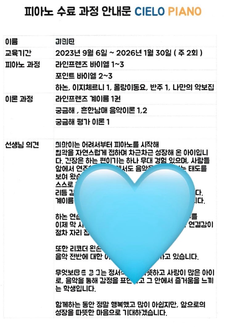 안녕하세요 시엘로피아노 원장입니다. 오늘은 조금 아쉬운 마음으로 이 글을 남깁니다. 이별은 언제나 예고 없이 찾아올 수 있습니다. 그래서 시엘로피아노는 함께하는 시간만큼이나 마무리의 순간을 중요하게 생각합니다. 수업을 시작할 때도, 그리고 수업을 마칠 때도 아이의 시간을 가볍게 흘려보내지 않기 위해서입니다. 오늘은 한 아이의 수료를 정리하며 그동안의 시간을 차분히 돌아보았습니다. 어려운 과정 속에서도 포기하지 않고 끝까지 해내려 했던 태도, 음악 앞에서 스스로를 다듬어 가던 시간들. 그 모든 과정은 아이에게도, 그리고 이 공간에도 소중한 기록으로 남았습니다. 시엘로피아노는 ‘언제까지 다니는가’보다 어떻....... <img src="https://blogthumb.pstatic.net/MjAyNjAxMjlfMjIg/MDAxNzY5Njg2MjAzNDYy.zeT7VNlcVVkwM02LfdTuTExsc3edjQnYmXFtu4rzsL4g.Y-WgZ2kKO311e_oIxoC8GwEd_Vxzkr0WcQ_b9BswThAg.JPEG/IMG%A3%DF0702.jpg?type=s3" />