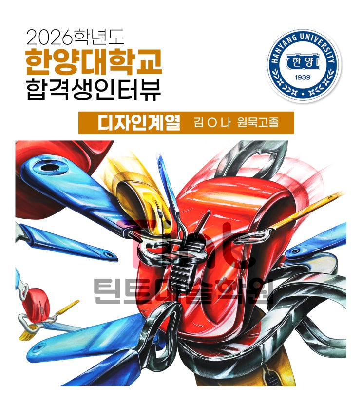 안녕하세요! 디자인 입시전문 틴트미술학원입니다. Q. 지원학과의 지원동기는 무엇이며, 어떻게 준비했나요? A. 디자인 계열로 모집하기 때문에 영상이나 시각, 패션 등 모두 수업을 들어보고 과를 결정하는 점이 좋다고 생각이 들어서 지원하게 되었습니다! 한양대학교는 문제은행으로 30개의 소재를 a,b,c 그룹으로 나누어 그 중 두 그룹을 랜덤으로 뽑아 각 그룹 당 한 소재씩 소재 두 개가 나오는 방식ㅇ었는데 정시특강을 하며 연합시험에 한양대 소재들이 많이 나왔다보니 거의 다 그려보고 시험장에 들어갈 수 있었던 것 같습니다. 또 제가 안 그려봤던 개체나 못그리는 개체들을 연습할 시간을 주시고 최대한 다 그려보도록 형태연습도 시....... <img src="https://blogthumb.pstatic.net/MjAyNjAyMjVfMjQg/MDAxNzcyMDE3MjkzNjUy.qpdkBKJTWDvZIZxI9-I6u5czA5g_MqgMvFa-xPootM8g.S8C1fr3lfe2JpQsJDM-HfAku9mS7gjarsCIayMjiuZ8g.JPEG/2026_%C7%D1%BE%E7%B4%EB_%C7%D5%B0%DD_%B5%F0%C0%DA%C0%CE%B0%E8%BF%AD_%C7%D5%B0%DD%BB%FD%C0%CE%C5%CD%BA%E41.jpg?type=s3" />